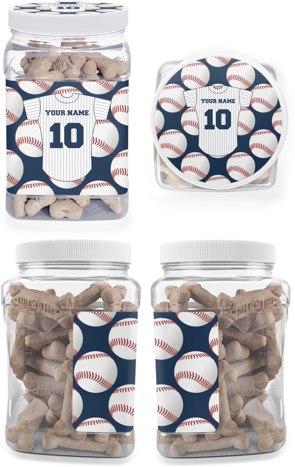 This half gallon jar, made from a sturdy plastic, is the perfect way to keep treats from any naughty pet paws, while still keeping them ready on hand for when your pup performs an impressive trick. This dog cookie jar features a screw-on, white lid that displays your personalized design on a vinyl sticker. We apply another customized sticker that wraps around the front and sides of the jar. Our dog treat jar also has indentations on the rear ends of the sides, which allows for convenient handling, and its square frame allows for easy storage.