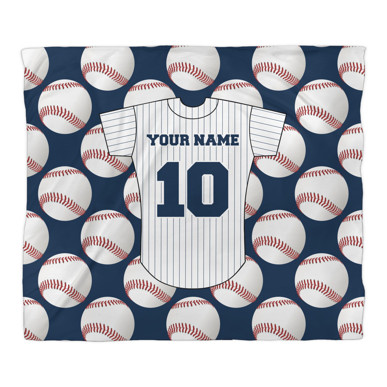 This design with baseballs in the background and a baseball jersey for name & number personalization will perfect for the baseball fanatic. The colors can all be changed - so you can change the colors to match your team color - the background color, the color of the jersey sleeves, the body and even the stripes' color can be changed!