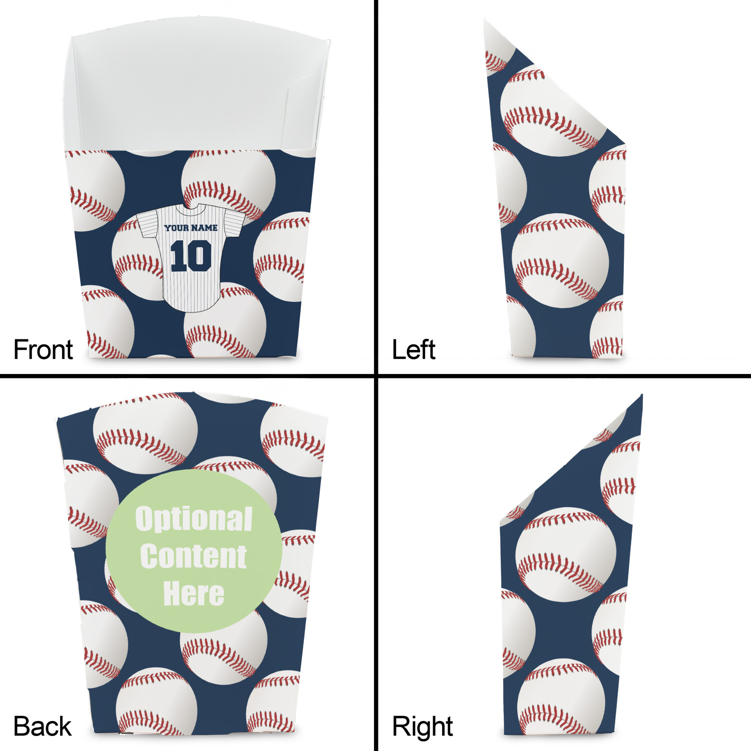 The personalization we have chosen is name and number on the back of the baseball jersey. We have also used the front of the jersey for the team name in the coordinating design. You have the choice of using the back as we have, or the front of the jersey or use both and add the team name to the personalization.