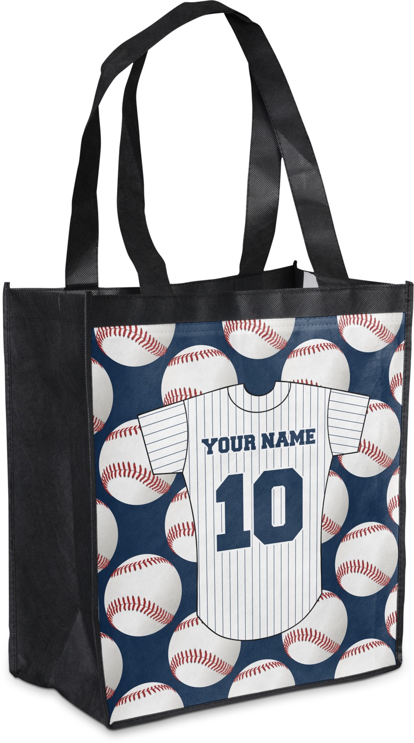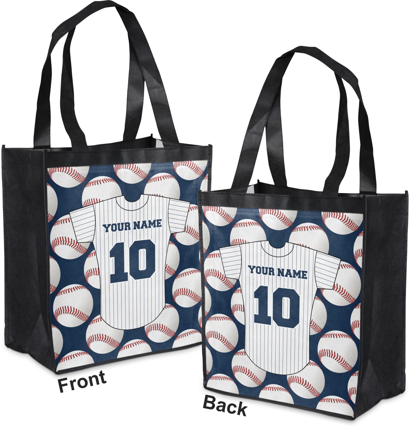 Made from a durable, biodegradable material, these reusable shopping bags can support up to 30 pounds of weight. With two large handles, measuring at 8.5 inches each, these personalized tote bags are easy to carry to your vehicle or home. The bag itself is 12 by 13.5 inches, and can expand to a depth of 7 inches. Your customization is printed on both the front and back, while the remaining sides, trim, and handle are a sleek, charcoal black.