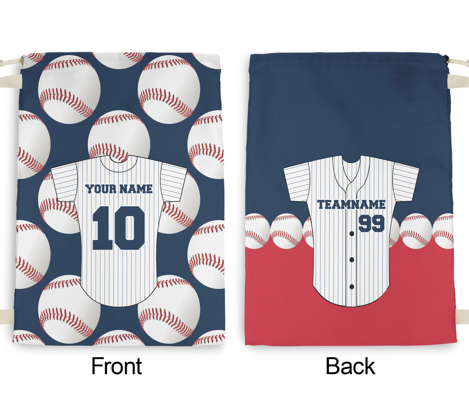 Carry your laundry in style with these customized laundry bags. Available in two sizes, featuring a natural colored woven strap and a cinch cord, these bags hold a lot of clothes or anything else you want to fit in them.