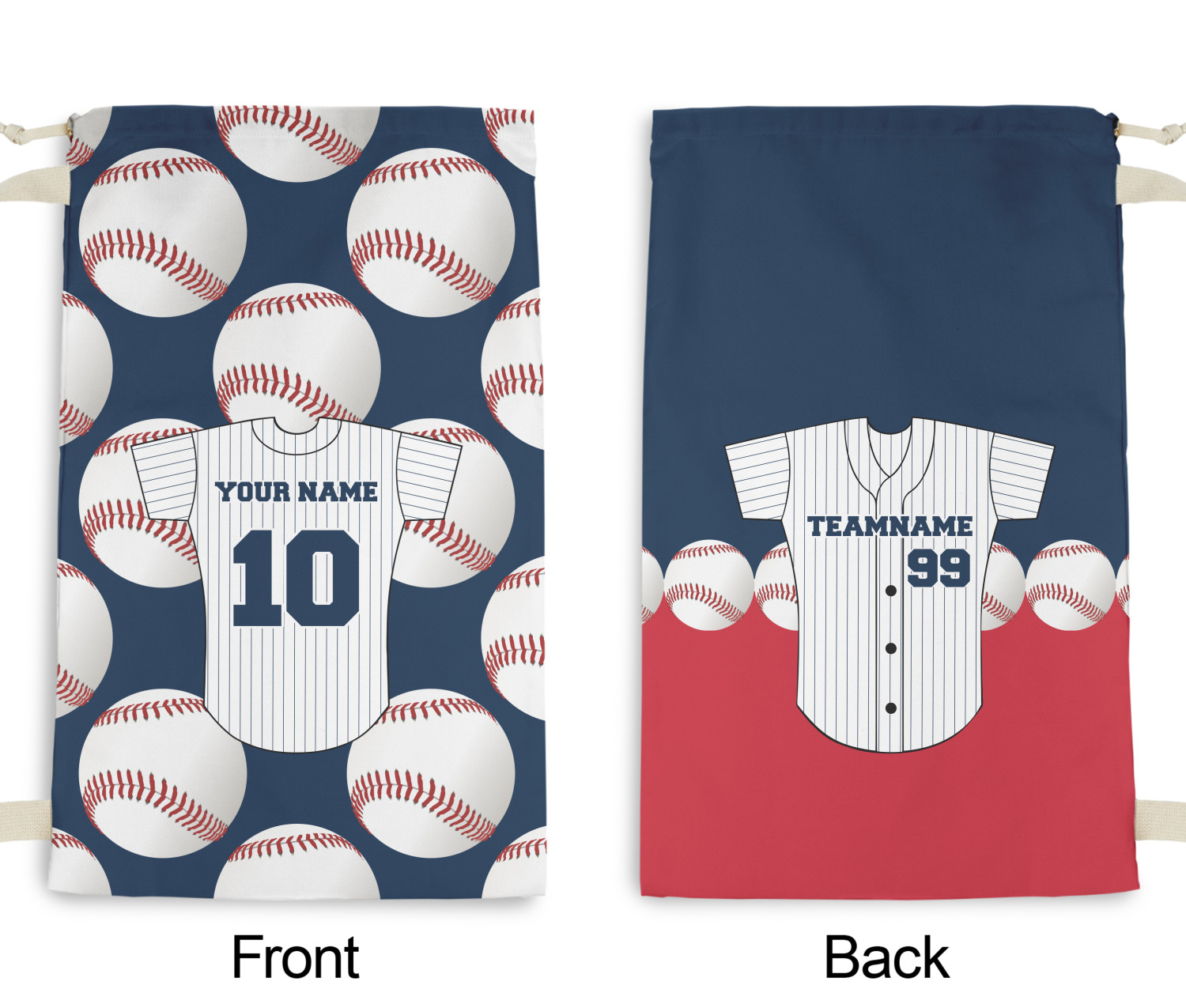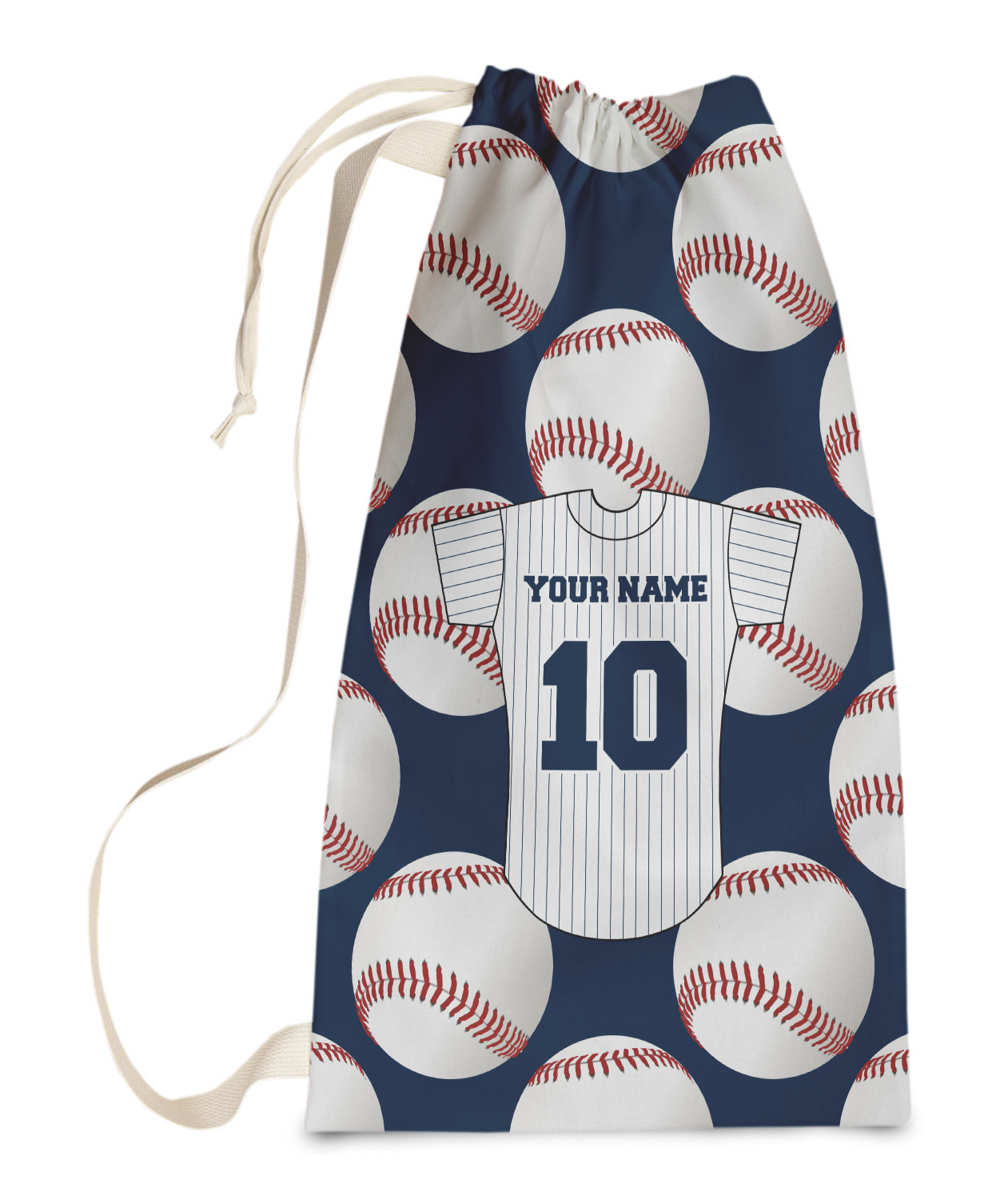Carry your laundry in style with these customized laundry bags. Available in two sizes, featuring a natural colored woven strap and a cinch cord, these bags hold a lot of clothes or anything else you want to fit in them.