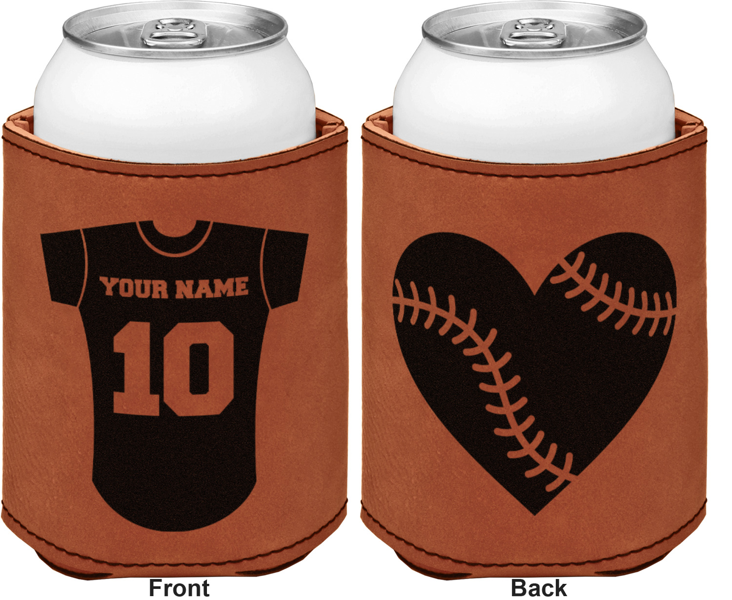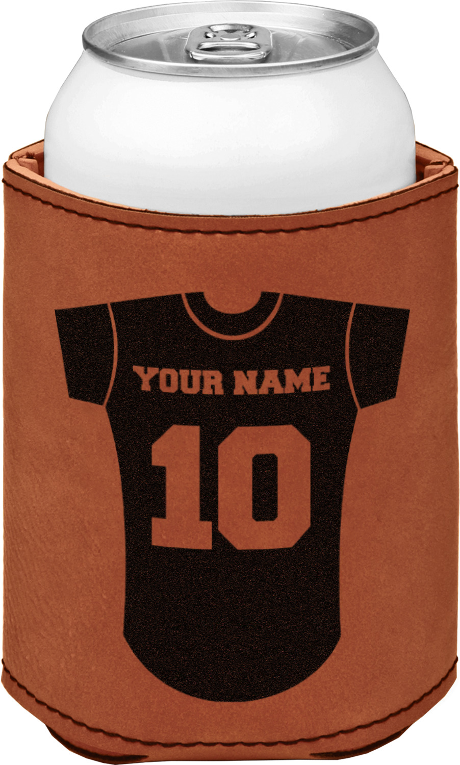 This can sleeve is made from a cognac-brown leatherette and stitched with a sturdy, black thread. A slim padding lines the inside of your can sleeve to allow for a better fit once your drink is inserted. The sleeve itself measures at 4 by 4.5 inches, allowing this custom can sleeve to accommodate most canned drinks. Your personalized design can be engraved on the front and back, or solely the front. When laser-engraved, your design appears as a black coloration which contrasts the leatherette nicely.