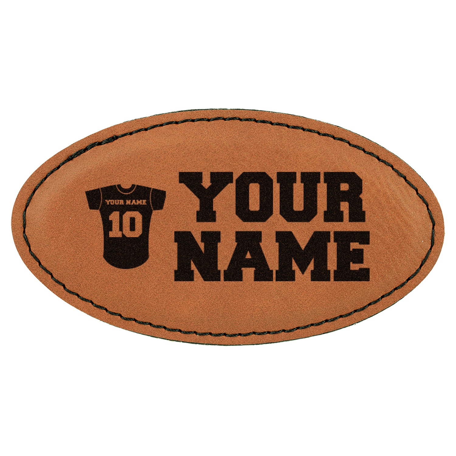 Made from a cognac-brown leatherette into an oval shape, these custom name badges measure at around 3.25" x 1.75". To add the suave appearance of this custom badge, a fine black stitching lines the edges or the badge itself. Your customized design is laser-engraved onto the surface of the leatherette. Accompanying your purchase is a removable magnet strip that can be used to secure the engraved name tag to any shirt, dress, or jacket.