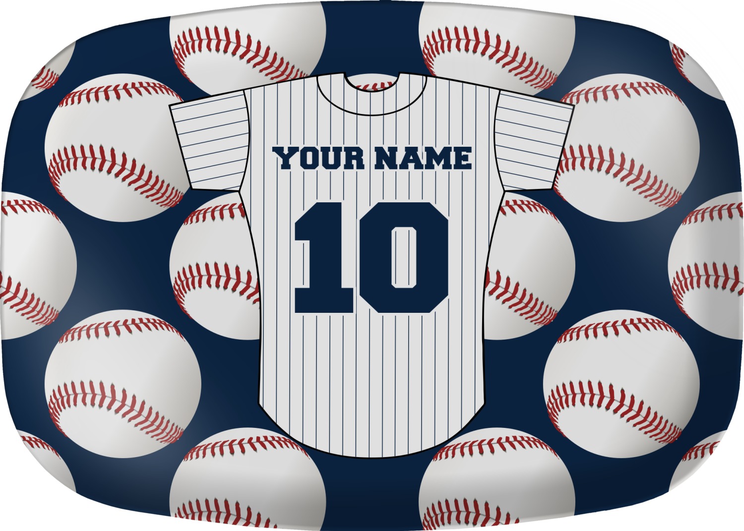 This design with baseballs in the background and a baseball jersey for name & number personalization will perfect for the baseball fanatic. The colors can all be changed - so you can change the colors to match your team color - the background color, the color of the jersey sleeves, the body and even the stripes' color can be changed!