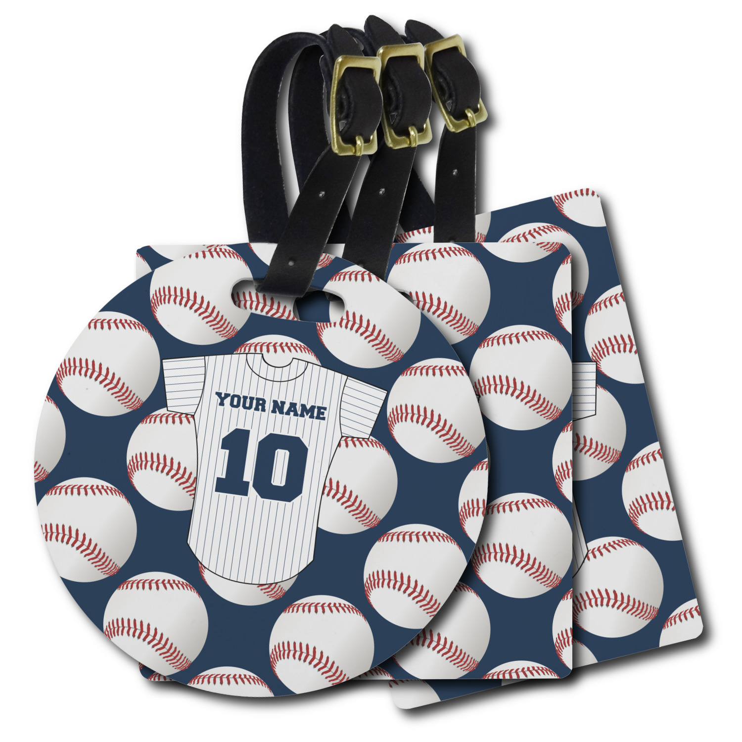These personalized bag tags are sold in a variety of shapes, so that you may find the product that meets your vision exactly. We sell a round luggage tag, which measures at approximately 4" x 4". Our square luggage tag is about 3.5" x 3.5", while our rectangular version is 2.75" x 4 ".