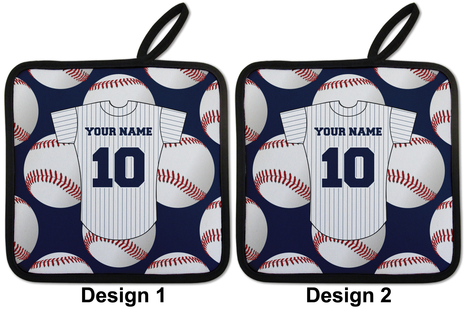 Our personalized pot holders feature a neoprene front that displays your personalization in vibrant colors. The backing of the hot pot holder is rubberized; the textured backing allows you to have a great grip when using this custom pot holder. The two materials are joined with a sleek, black trim, and the holder also includes an attached loop for hanging and storage. The pot holder is approximately 8.75 inches by 8.75 inches and 0.25 inches tall, while the fabric loop is 2.5 inches long. You can purchase a kitchen pot holder by itself or as a set of 2. We also offer a set including one pot holder and one oven mitt.