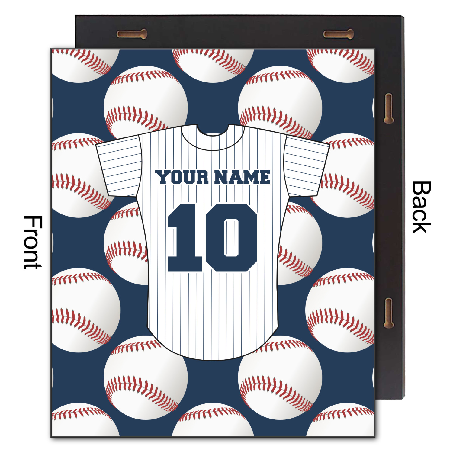 This design with baseballs in the background and a baseball jersey for name & number personalization will perfect for the baseball fanatic. The colors can all be changed - so you can change the colors to match your team color - the background color, the color of the jersey sleeves, the body and even the stripes' color can be changed!