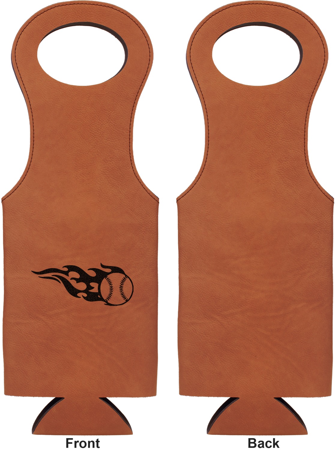 This wine carrier is made from a stunning leatherette, in a cognac-brown color. Strong, black stitching lines the sides of your wine bottle bag and provides extra durability. The interior is lined with a padded, black material to allow for a snug fit once your bottle is placed inside. At the top of this wine gift bag, you'll find two oval shaped handles that elegantly complements the rest of the bag's style. We provide you with the option of laser-engraving the front, or the front and back of your new personalized wine bag!