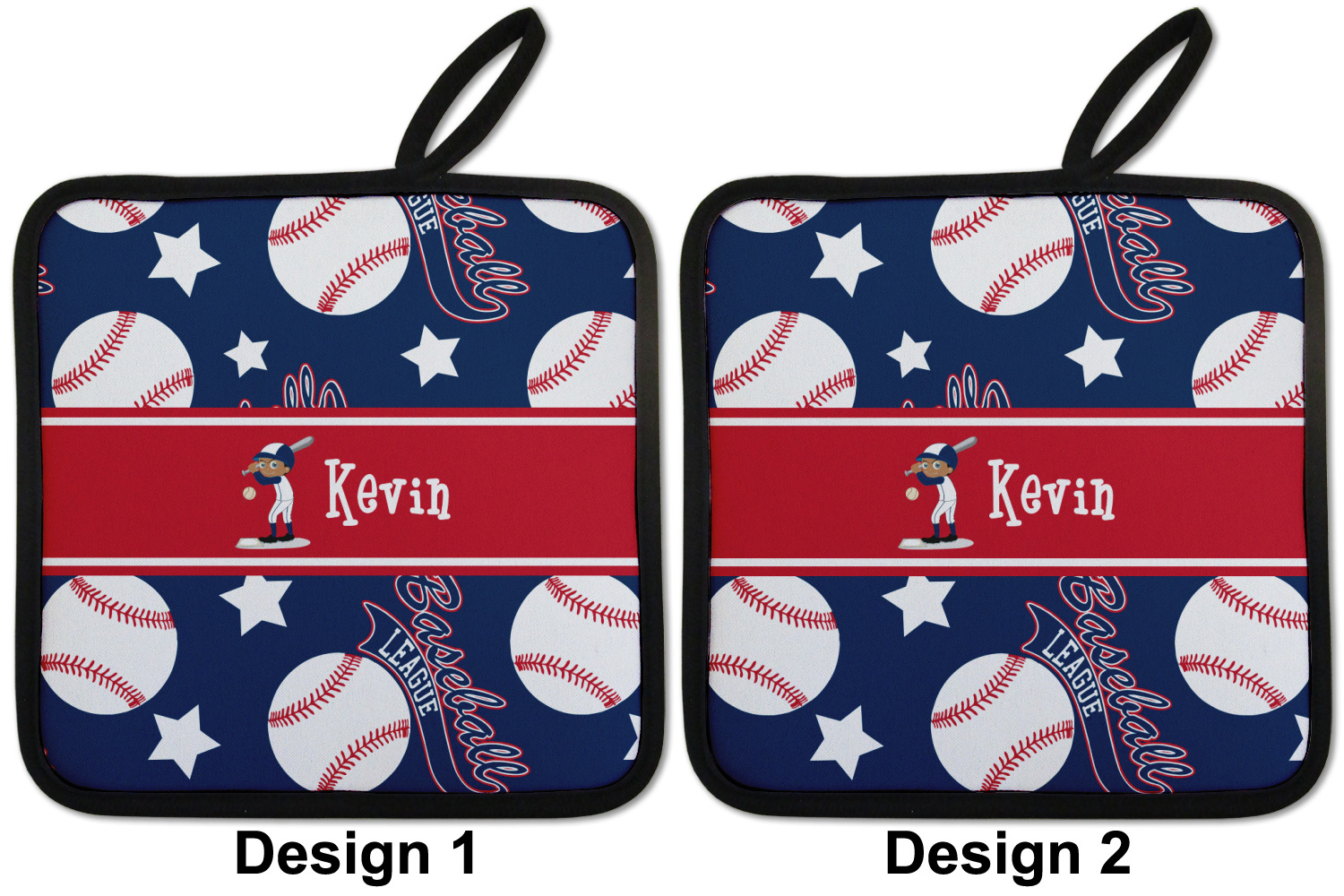 Our personalized pot holders feature a neoprene front that displays your personalization in vibrant colors. The backing of the hot pot holder is rubberized; the textured backing allows you to have a great grip when using this custom pot holder. The two materials are joined with a sleek, black trim, and the holder also includes an attached loop for hanging and storage. The pot holder is approximately 8.75 inches by 8.75 inches and 0.25 inches tall, while the fabric loop is 2.5 inches long. You can purchase a kitchen pot holder by itself or as a set of 2. We also offer a set including one pot holder and one oven mitt.