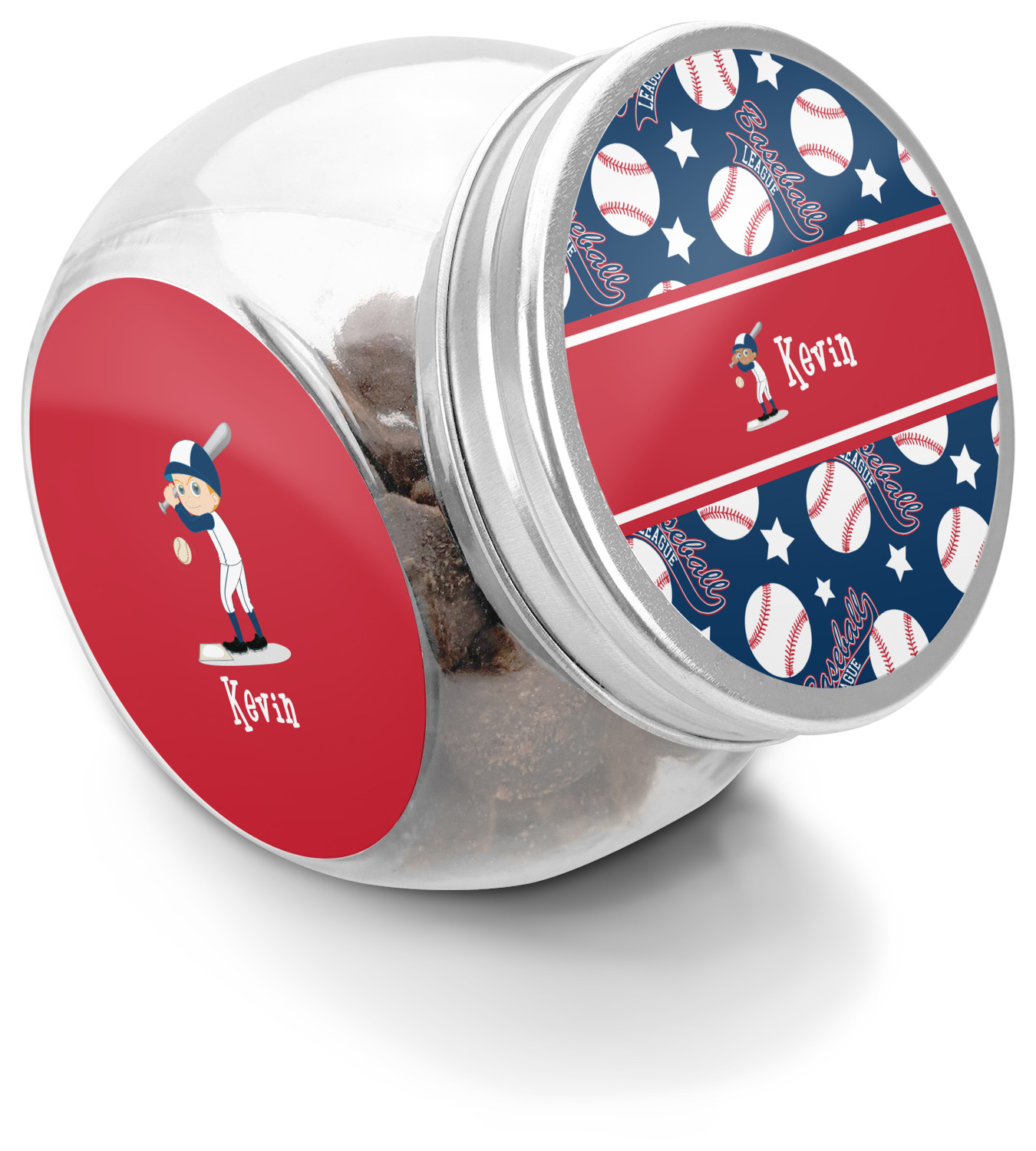 This treat jar is an excellent way to store treats for your favorite canine or feline. Moreover, their delicate, classy appearance makes them a tasteful addition to your countertop's décor. Crafted from clear glass, its unique construction and silver metal, screw-on lid allows for quick and easy access. Three, permanent, vinyl stickers are applied to both sides of the jar and lid, presenting your personalized design. The base of this glass, dog treat jar is 3.4" x 4.75", and the jar stands at 5" tall. Though on the smaller side, this jar is best suited for smaller treats or training treats.