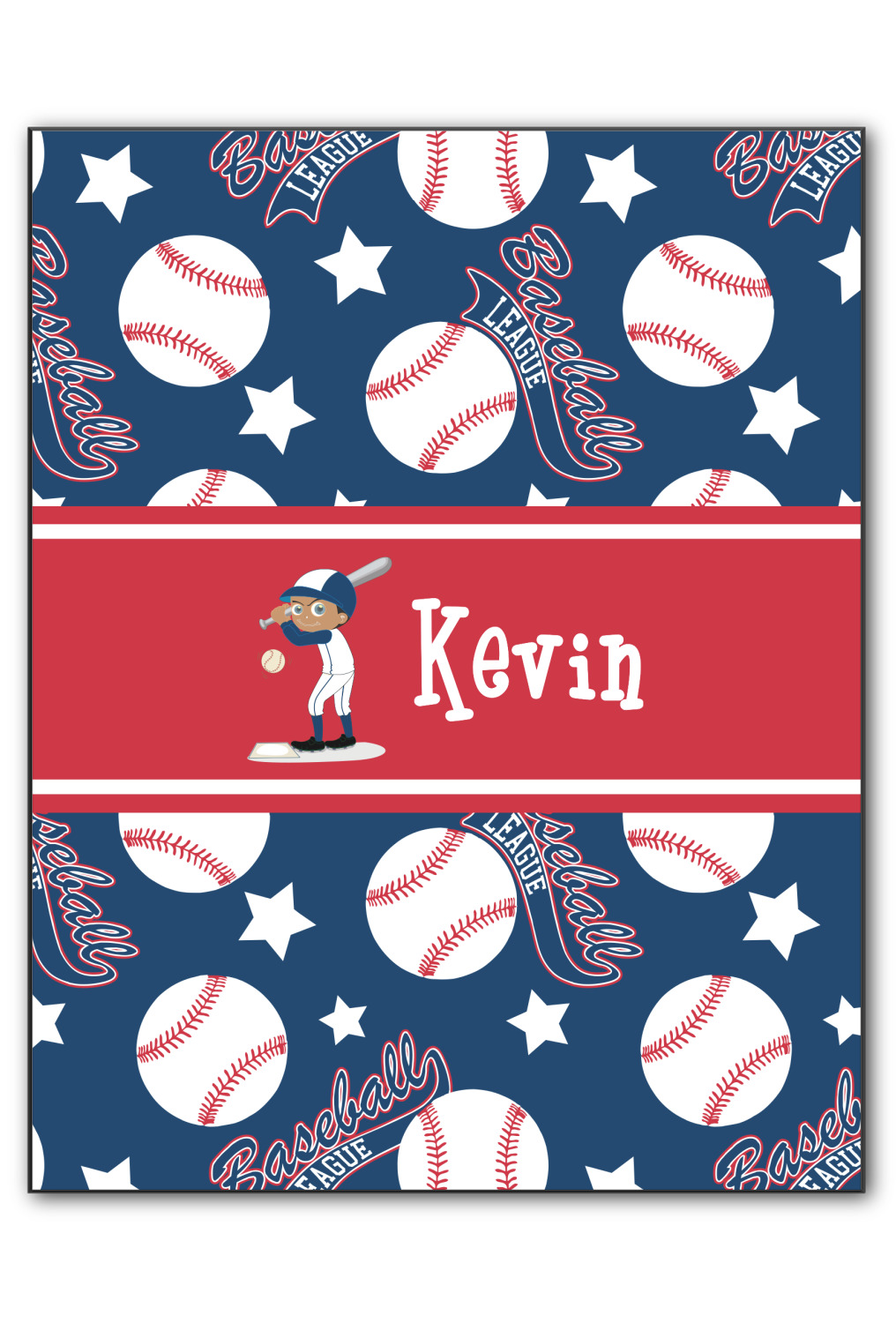 This baseball design is sure to please any baseball fan. The background in classic blue, with baseballs, baseball league banner and stars in red & white make this a classic color scheme for any boy. We have chosen to customize it with a red ribbon and have added a baseball player with his name as the personalization. The uniform on the baseball can be customized to his team colors. You can also customize his hair, skin and eye color as well.