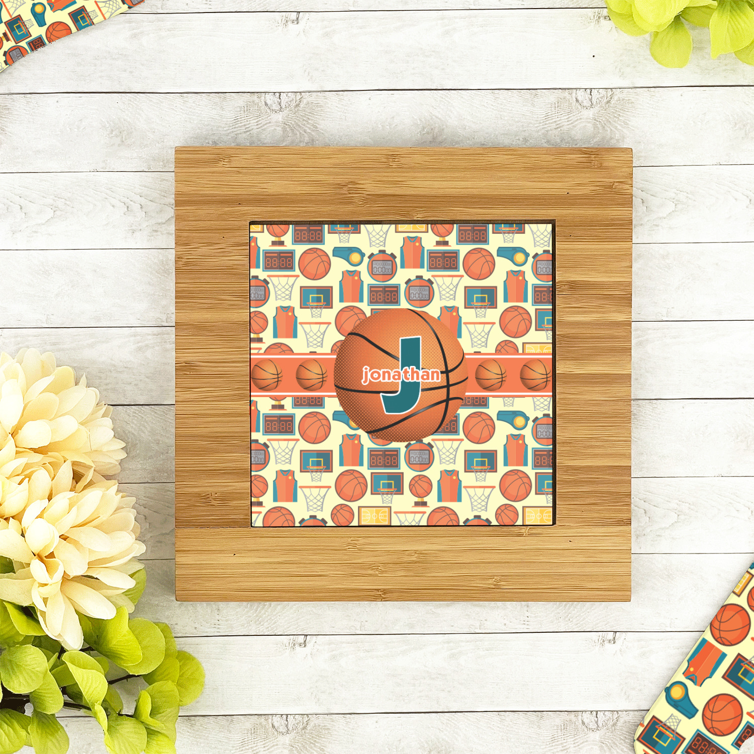 This is a fun design full of basketball graphics! The background has hoops, balls, jerseys, stop watches, and more! The colors are a fun combination of orange, teal, and yellow. The ribbon is orange and white striped with a fun basketball frame to go with it. The coordinating design is also fun with the same pattern but different colors! All elements are easily interchangeable for all of your personalizing needs.