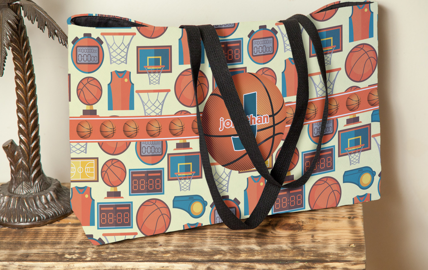 The totes are made from a sturdy canvas material on the outside and are lined with a black poly cotton lining. The beach totes have an approx. 28" black woven handles.