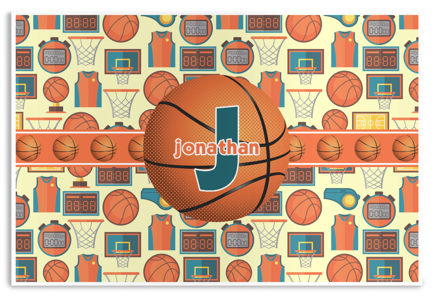 This is a fun design full of basketball graphics! The background has hoops, balls, jerseys, stop watches, and more! The colors are a fun combination of orange, teal, and yellow. The ribbon is orange and white striped with a fun basketball frame to go with it. The coordinating design is also fun with the same pattern but different colors! All elements are easily interchangeable for all of your personalizing needs.