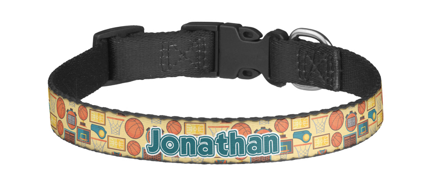 This sturdy collar, made from a durable nylon weave, will outlive your dog's episodes of excited tugging and pulling. Courtesy of its thick plastic buckle and adjuster, this collar is adjustable and accommodating of any dog. Structurally, the collar is a single piece of nylon weave that is sewn together, and features a solid metal loop where you can attach a leash or dog tag. We print and display your dog's name and pattern across the middle of the personalized dog collar.