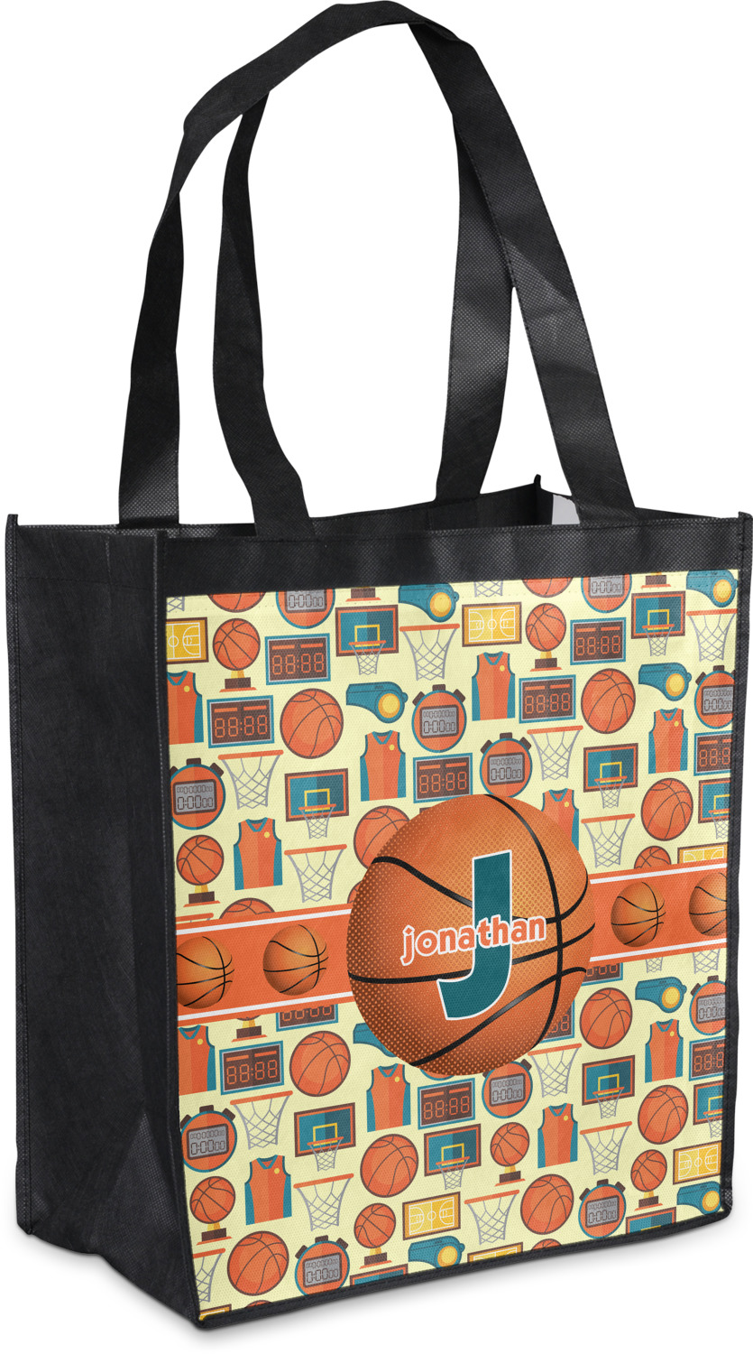 Made from a durable, biodegradable material, these reusable shopping bags can support up to 30 pounds of weight. With two large handles, measuring at 8.5 inches each, these personalized tote bags are easy to carry to your vehicle or home. The bag itself is 12 by 13.5 inches, and can expand to a depth of 7 inches. Your customization is printed on both the front and back, while the remaining sides, trim, and handle are a sleek, charcoal black.