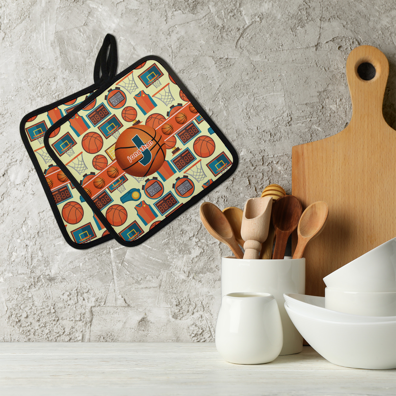 Our personalized pot holders feature a neoprene front that displays your personalization in vibrant colors. The backing of the hot pot holder is rubberized; the textured backing allows you to have a great grip when using this custom pot holder. The two materials are joined with a sleek, black trim, and the holder also includes an attached loop for hanging and storage. The pot holder is approximately 8.75 inches by 8.75 inches and 0.25 inches tall, while the fabric loop is 2.5 inches long. You can purchase a kitchen pot holder by itself or as a set of 2. We also offer a set including one pot holder and one oven mitt.