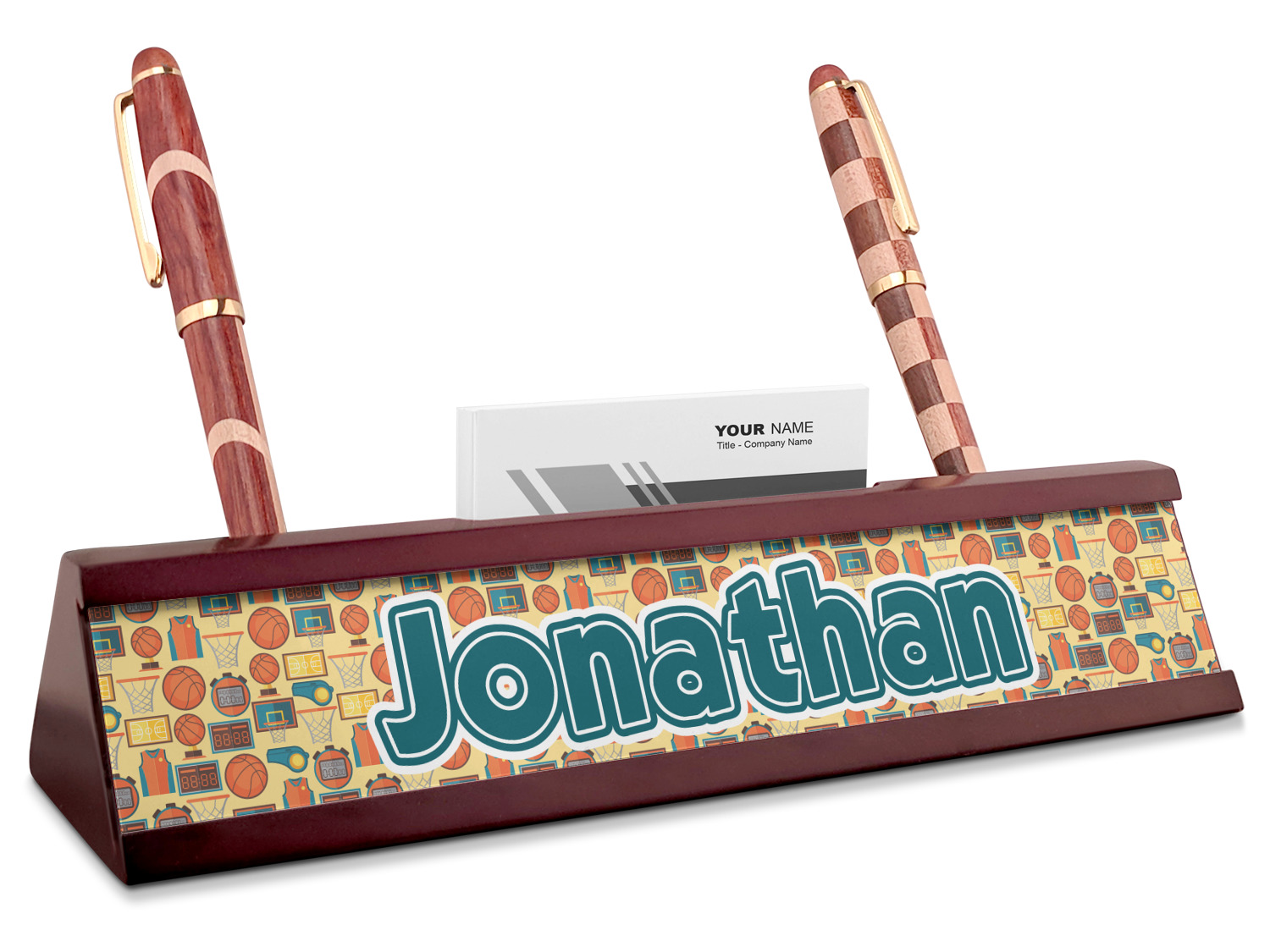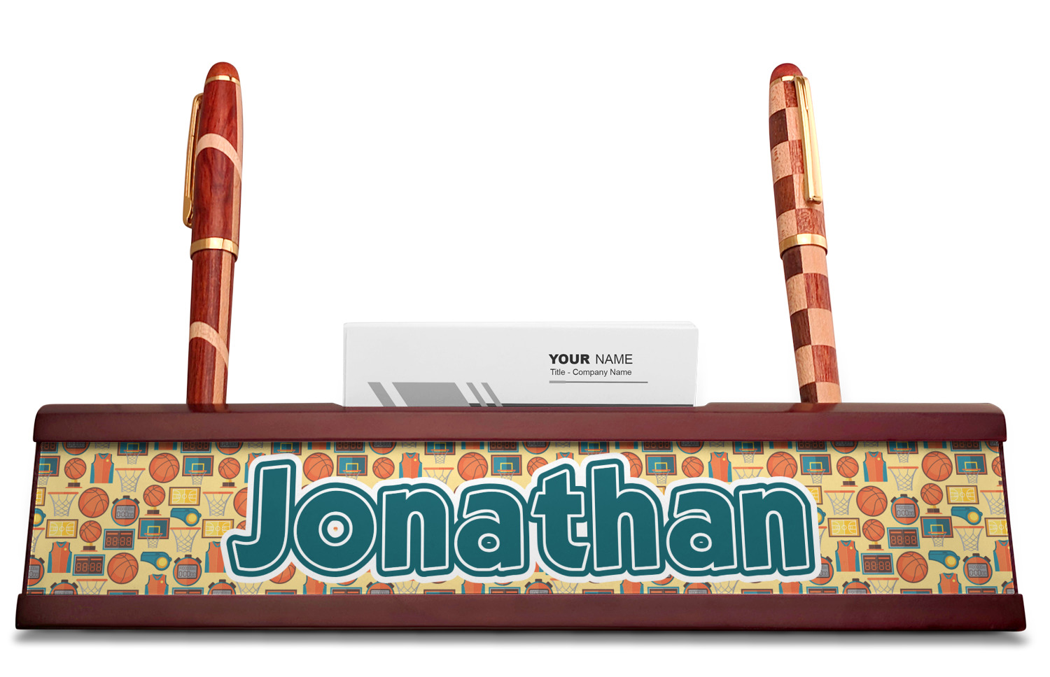 Your desk name plates are crafted from a high-quality, dark-cherry mahogany. At approximately 9.5 by 1.875 by 2.5 inches, this name plaque will fit perfectly, front and center, on your desk. Your customization spans across the entire face of the nameplate. Behind the nameplate lies a skinny slot that can fit approximately 15, traditionally-sized, business cards. You can also store your writing utensils on either side of this custom desk name plate.