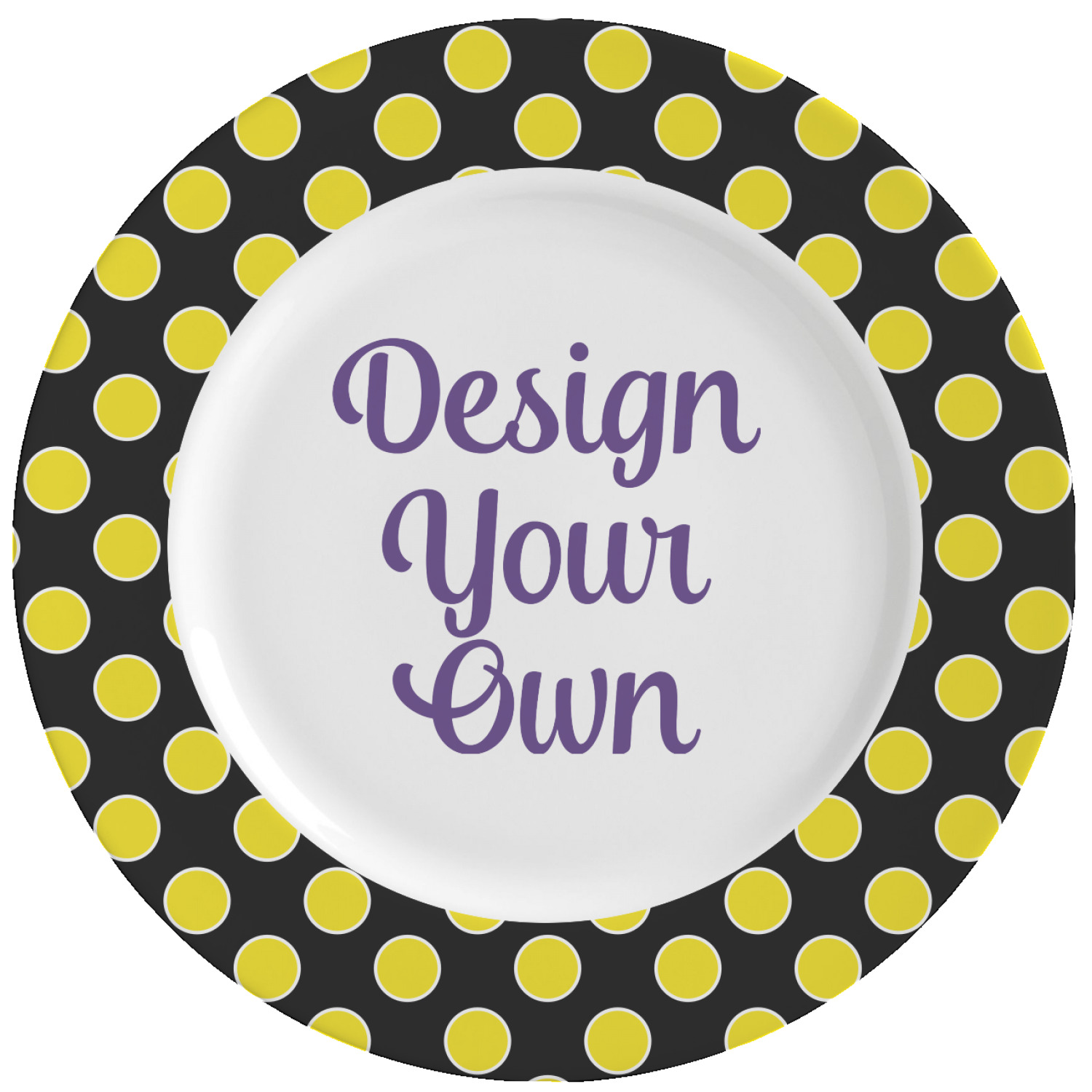 With this custom dinner plate, your have the option of personalizing the rim with an attractive pattern, and then displaying a name, graphic, or text in the center of the plate, against a white background. The exterior of this plate is also the same classic, white color. A glaze coats your plate, making your vividly colored design seem even more vibrant.