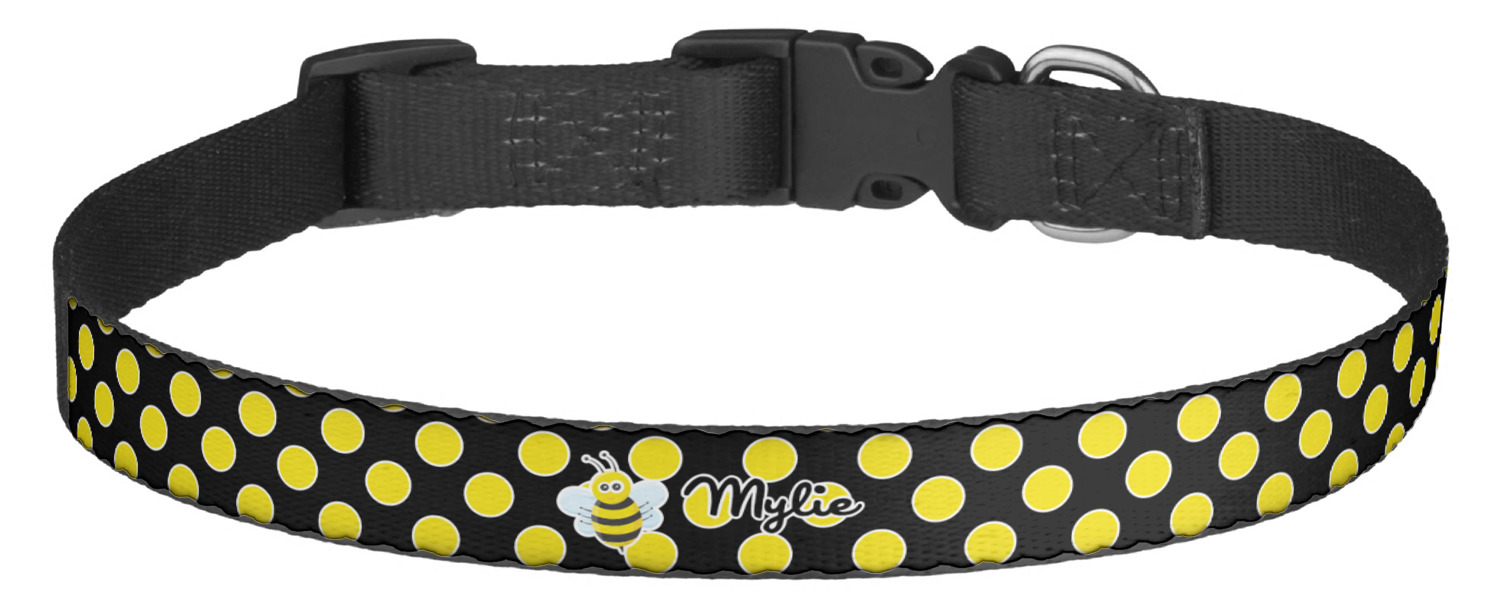 This sturdy collar, made from a durable nylon weave, will outlive your dog's episodes of excited tugging and pulling. Courtesy of its thick plastic buckle and adjuster, this collar is adjustable and accommodating of any dog. Structurally, the collar is a single piece of nylon weave that is sewn together, and features a solid metal loop where you can attach a leash or dog tag. We print and display your dog's name and pattern across the middle of the personalized dog collar.