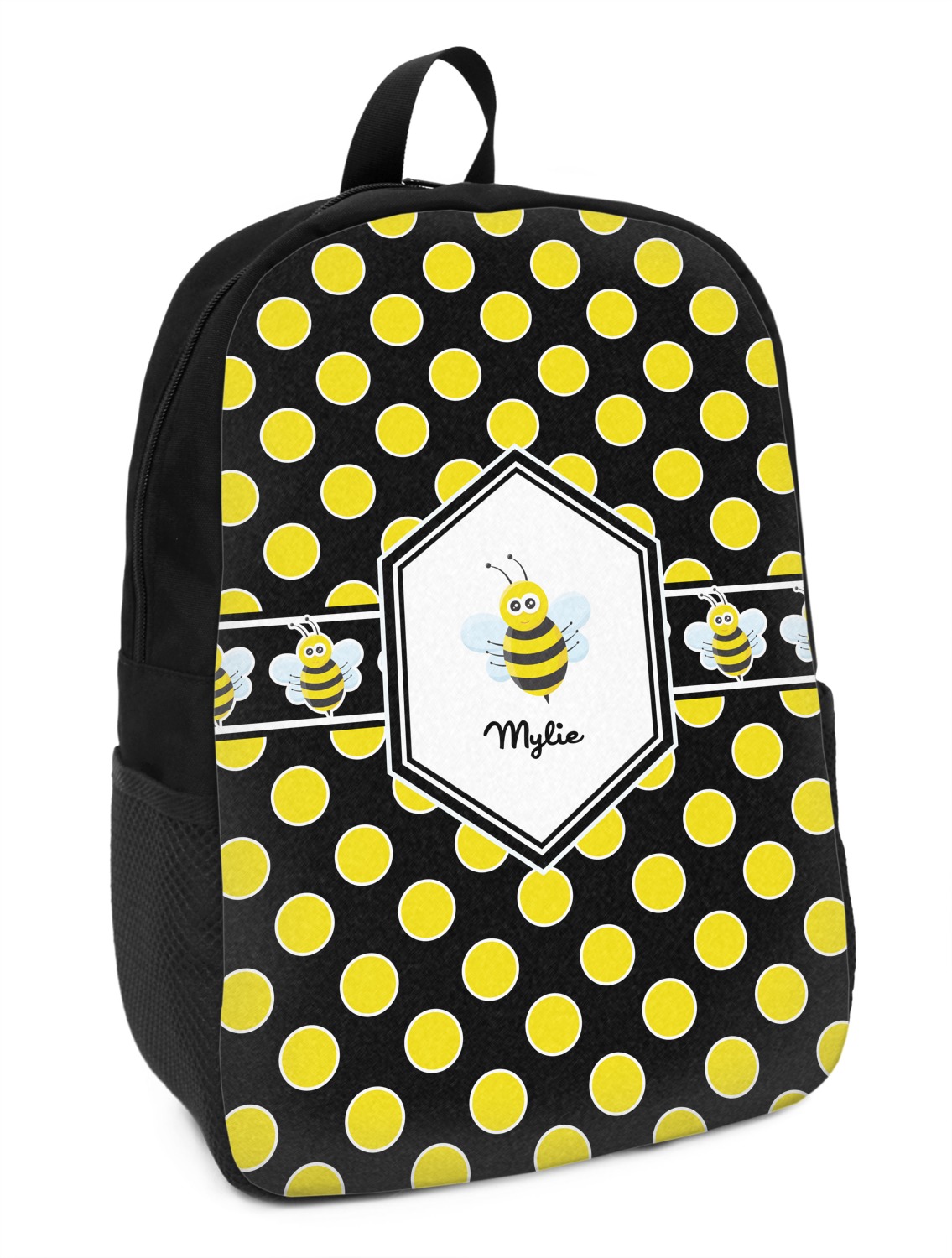 These small backpacks are made of a durable black canvas material with your personalization right on the front. The two shoulder straps are padded and easily adjustable. The bag itself measures at about 11" W x 15" H x 5" D. It's the perfect size for elementary aged kids or adults who want a smaller backpack. On the top of the bag you will find a handle to hang or carry your backpack by as well as a large zipper closure to keep all of your belongings safe inside. On each side of your backpack is a mesh pocket for a small item or water bottle. Inside your backpack you will find a spacious area with a small zipper pocket and a padded laptop slot that will fit up to a 13" laptop (13" being very snug). This is the perfect bag for any student that needs a couple books and their laptop with them at all times. It also works great as a carry on for traveling!