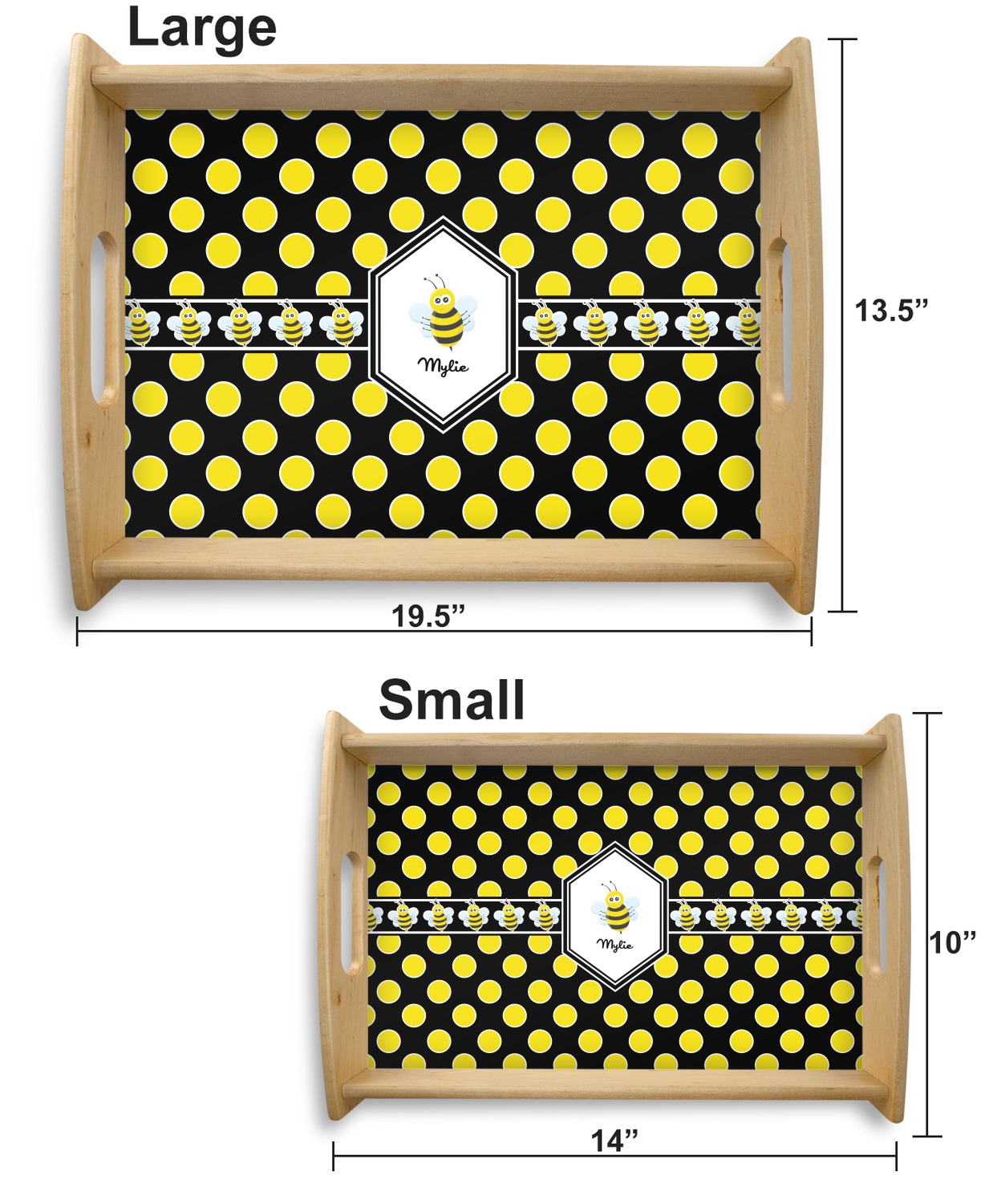 This serving tray with handles features square edges and two rounded sides, creating a very modern look. Each side is fabricated from a beautifully cut, natural wood. The bottom of the interior of the tray displays your customized design in bright, vibrant color. The tray is sold in both a black color and a natural wood look. Each variation of the wood serving tray has two sizes: Small, which is 14" x 10" x 2.25", and Large, which is 19.5" x 13.5" x 2.75".
