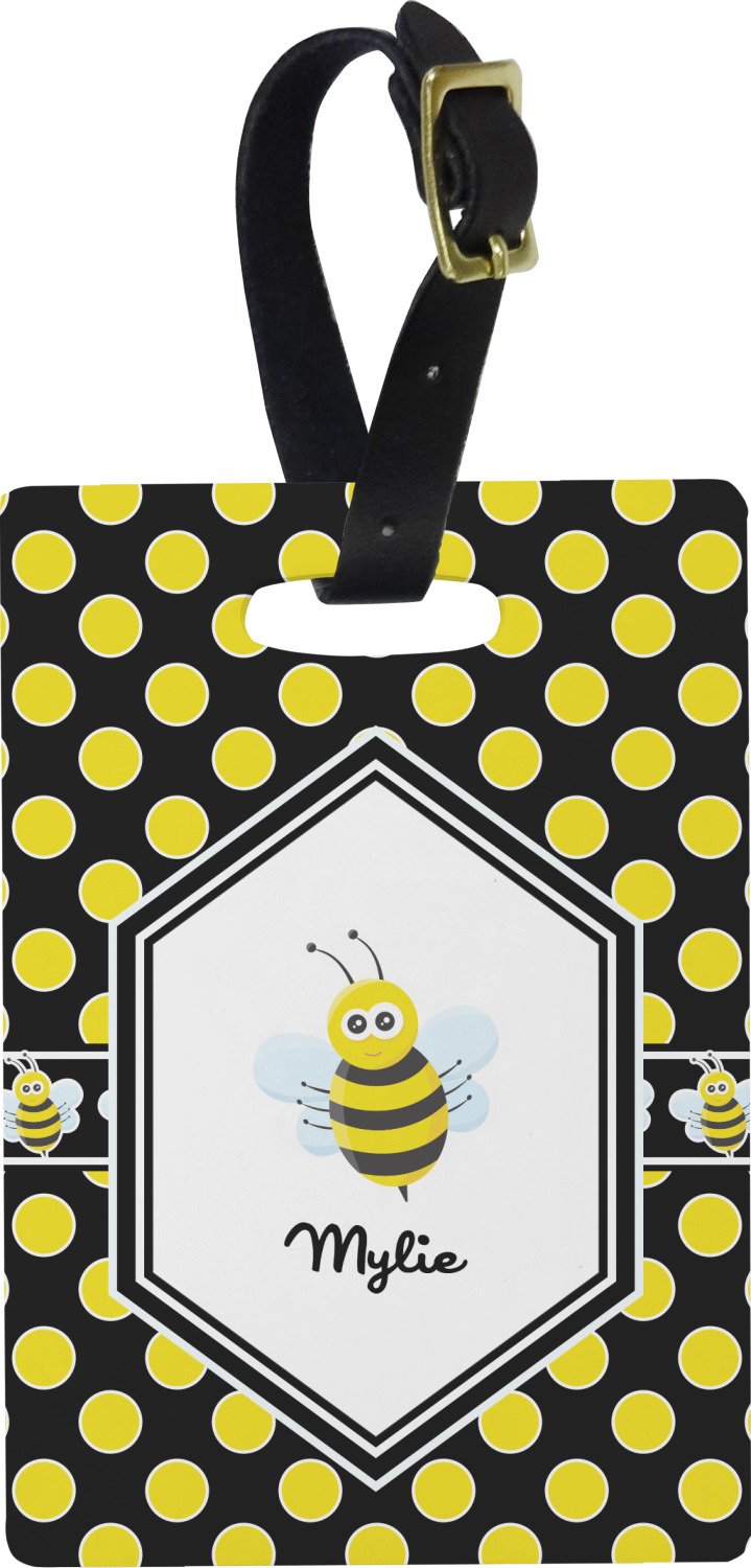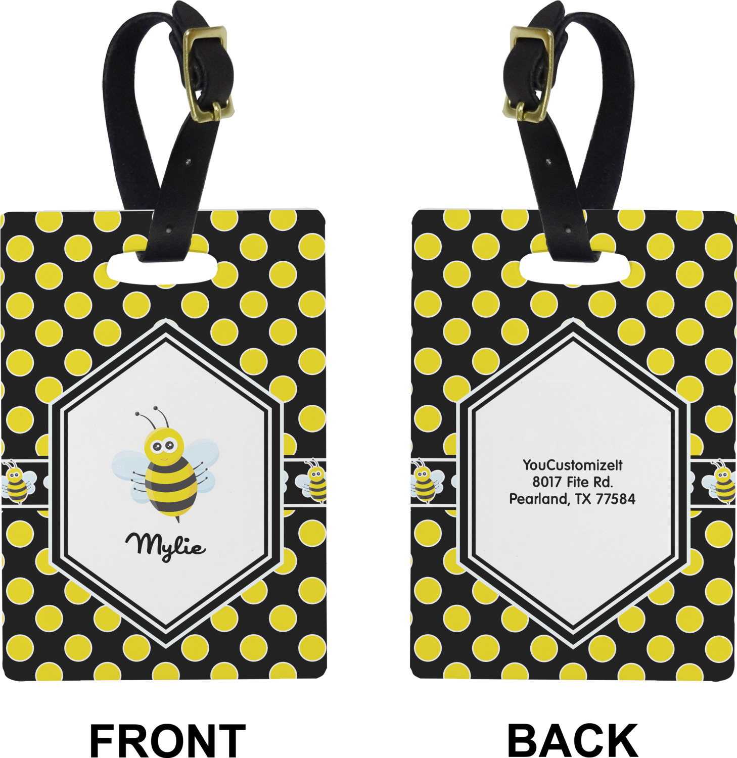 These personalized bag tags are sold in a variety of shapes, so that you may find the product that meets your vision exactly. We sell a round luggage tag, which measures at approximately 4" x 4". Our square luggage tag is about 3.5" x 3.5", while our rectangular version is 2.75" x 4 ".