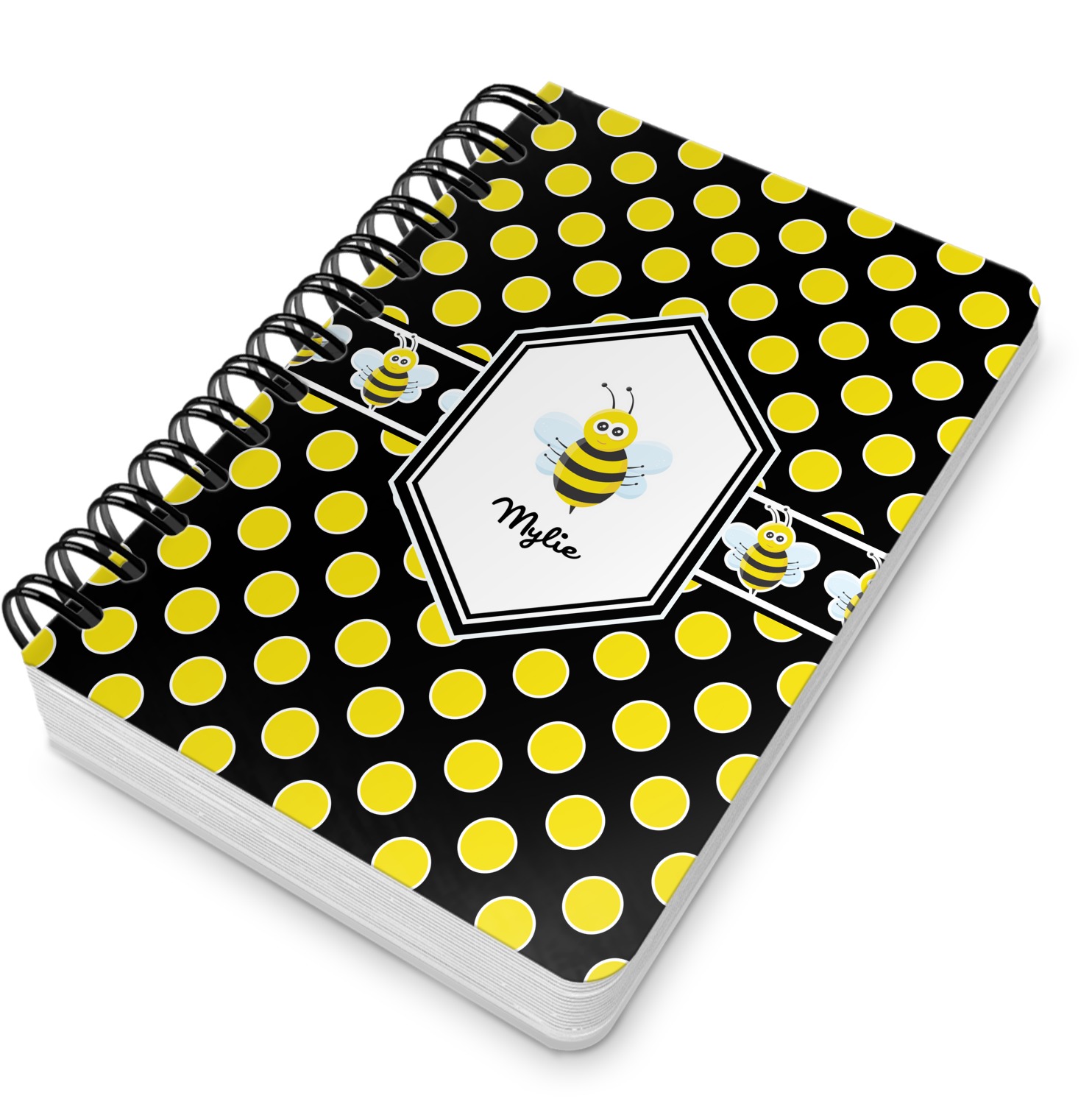 This spiral notebook includes 75 sheets of thick, ruled paper. The front and back of this custom notebook is made of a robust, laminate, plastic covering. We print your personalization on these two panels, underneath a glossy finish, which emphasizes the colors of your design. The two panels and the sheets of paper are held together by a sturdy, black coil. The paper within your bound notebook is perforated for easy, clean tearing.