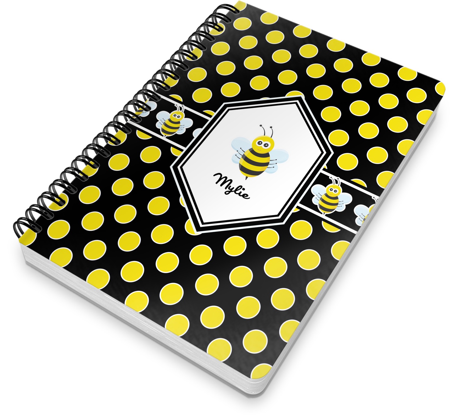This spiral notebook includes 75 sheets of thick, ruled paper. The front and back of this custom notebook is made of a robust, laminate, plastic covering. We print your personalization on these two panels, underneath a glossy finish, which emphasizes the colors of your design. The two panels and the sheets of paper are held together by a sturdy, black coil. The paper within your bound notebook is perforated for easy, clean tearing.