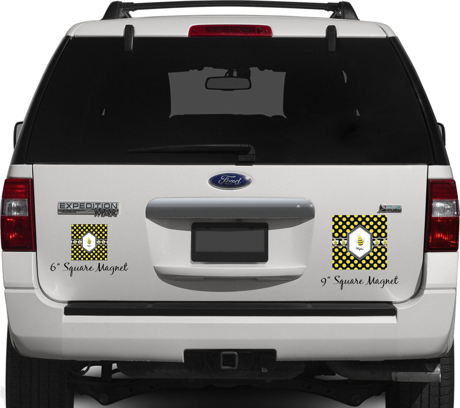 Your personalized car magnets are available for purchase in two shapes and two sizes. We carry round and square editions; each shape can either be 6 by 6 inches, or 10 by 10 inches, depending on your needs. Both versions are 1 millimeter thick, which is considered, within the industry, as the ideal thickness for automobile magnets. The magnetic car decals will adhere to any smooth, metal surface of your cars body, such as the trunk door or a side panel. However, please note that some vehicles are constructed from fiberglass bodies, which prevents the adhesion of anything magnetic. We advise that you test your vehicle before purchasing these magnets.