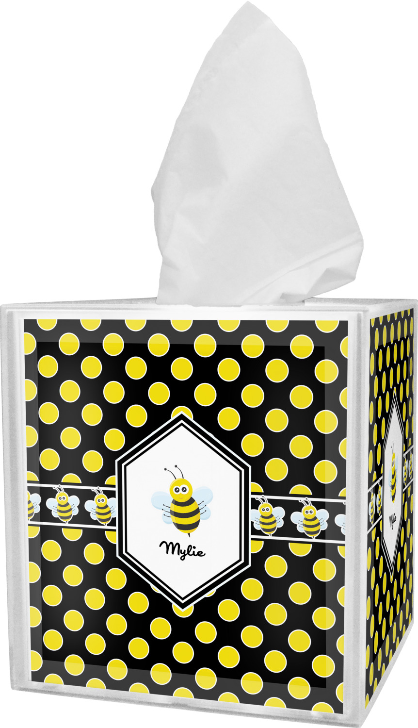 These tissue holders are built from durable acrylic and display your unique personalization on fine-quality vinyl inserts placed within the four sides and top. The box features two pieces, allowing you to easily switch out tissue boxes. On the sides, youll find ridges that ensure the top and base fit securely in place. The bottom of these tissue box holders has four, rubber, non-slip pads to prevent the box from scuffing any surface you decide to display it on. Each box can fit a standard 5 by 5-inch box of tissues.