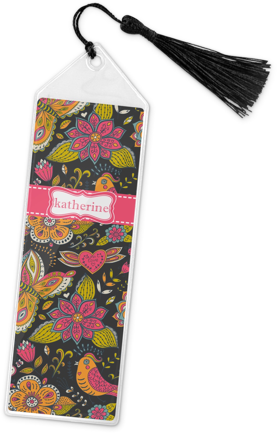 Your personalized bookmark is made of a sturdy, clear vinyl, and is approximately 7.5" x 2.25". We display your personalization on vinyl inserts that are placed on both sides. Accompanying each book marker is a black, fringe tassel that attaches to the reinforced, triangular header.