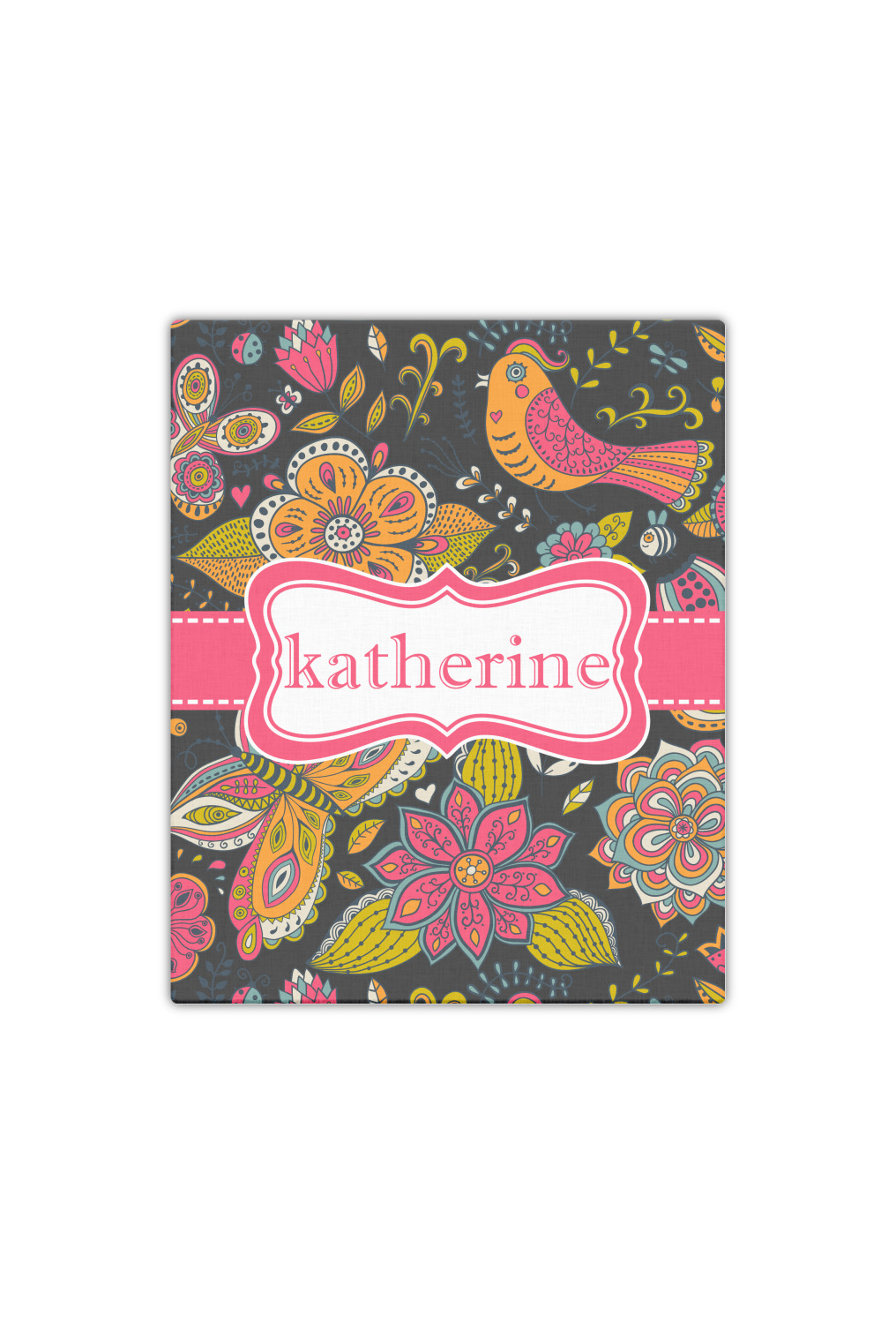 A pink ribbon with white stitching attached to a decorative white label trimmed in pink ties the entire design together. Add personalization of your choice in a coordinating color to make this pattern even more special.