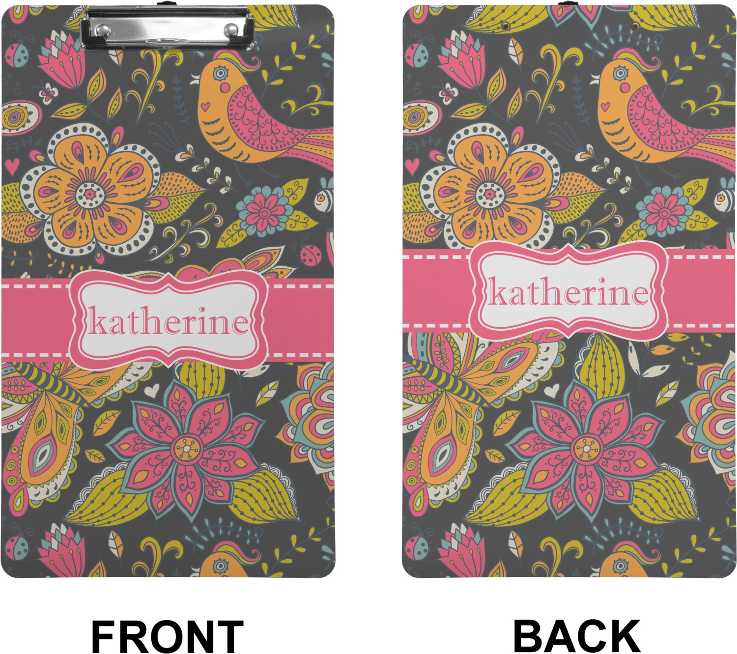These custom clipboards are made from a strong hardboard and are coated with a glossy finish that accentuates the colors of your design. Alongside a retractable hook at its top, these decorative clipboards also feature sturdy clips to secure several sheets of paper. We sell these clipboards in two separate sizes. Our letter size measures at 12.5" L x 9" W, while our legal clipboard is approximately 15.5" L x 9" W. On both models, your personalization is printed on both sides of this clipboard and can be customized individually.
