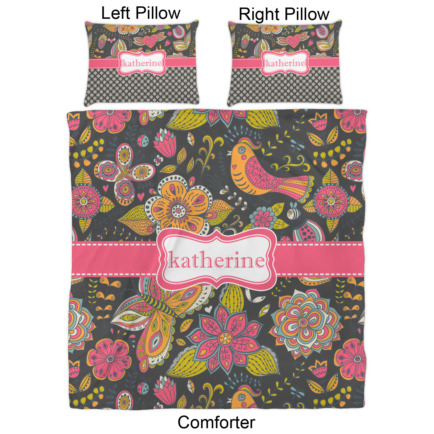 We have hundreds of different design templates for you to choose from Each design can be customized to your exact specifications. Not only can you customize the comforter, but you can also customize each pillow sham e.g. for a queen comforter set you have have Mr & Mrs pillow shams with the last name on comforter.