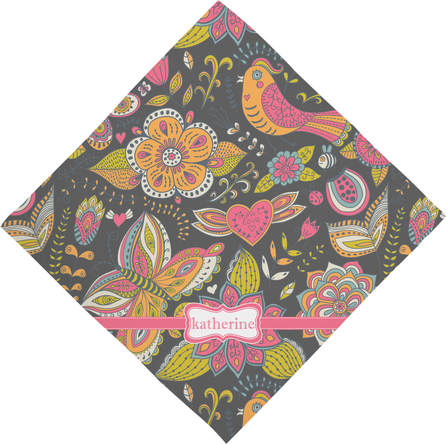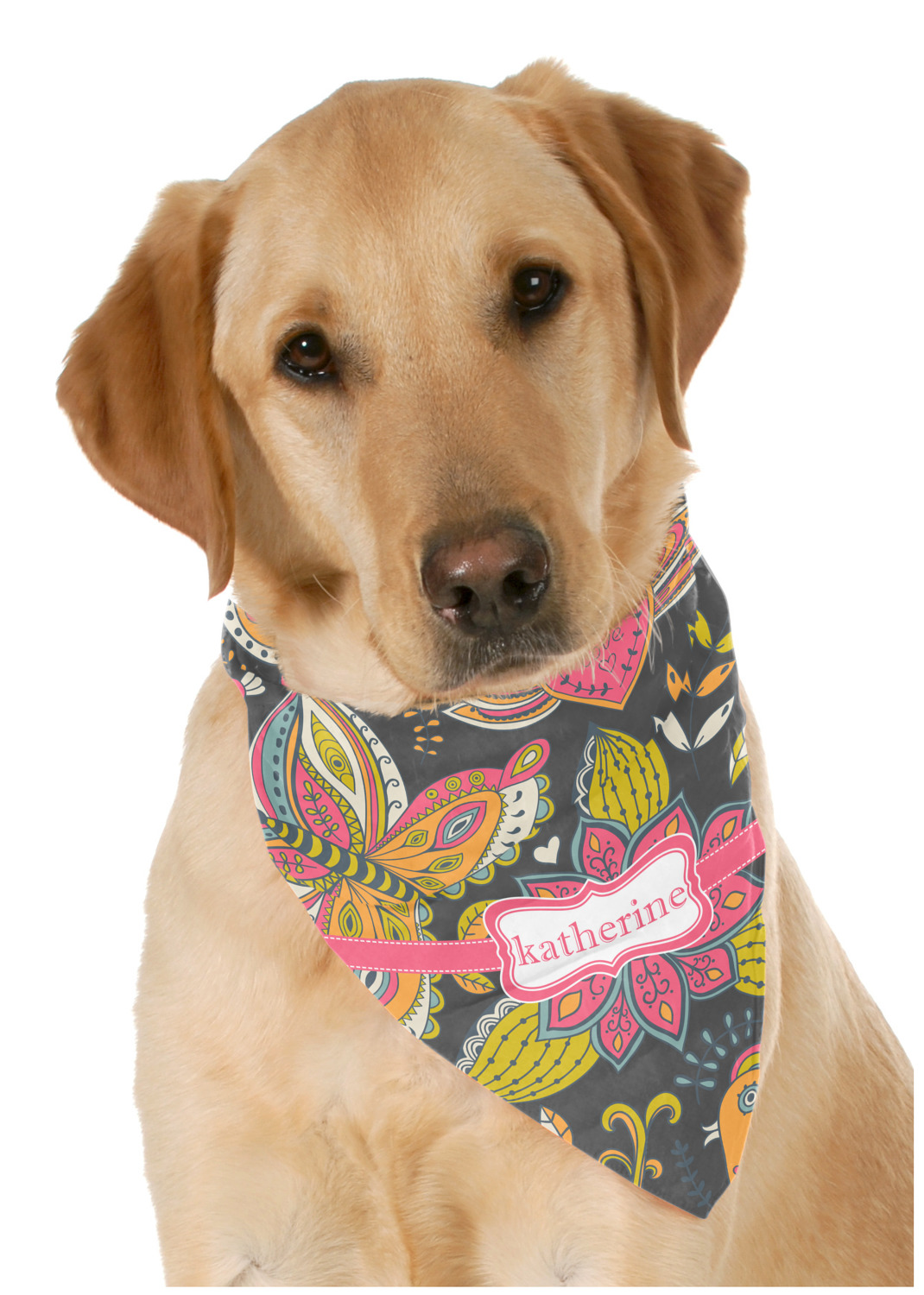 This beautiful pet bandana really is the perfect accessory. It is made from a silky feeling polyester and measures at approximately 23" x 23". Your personalization will be printed on a diagonal, so that you are able to read the personalization when folded into a triangle. This bandana fits best on large dogs, but can be folded smaller if there is no personalized text to fit smaller pets.