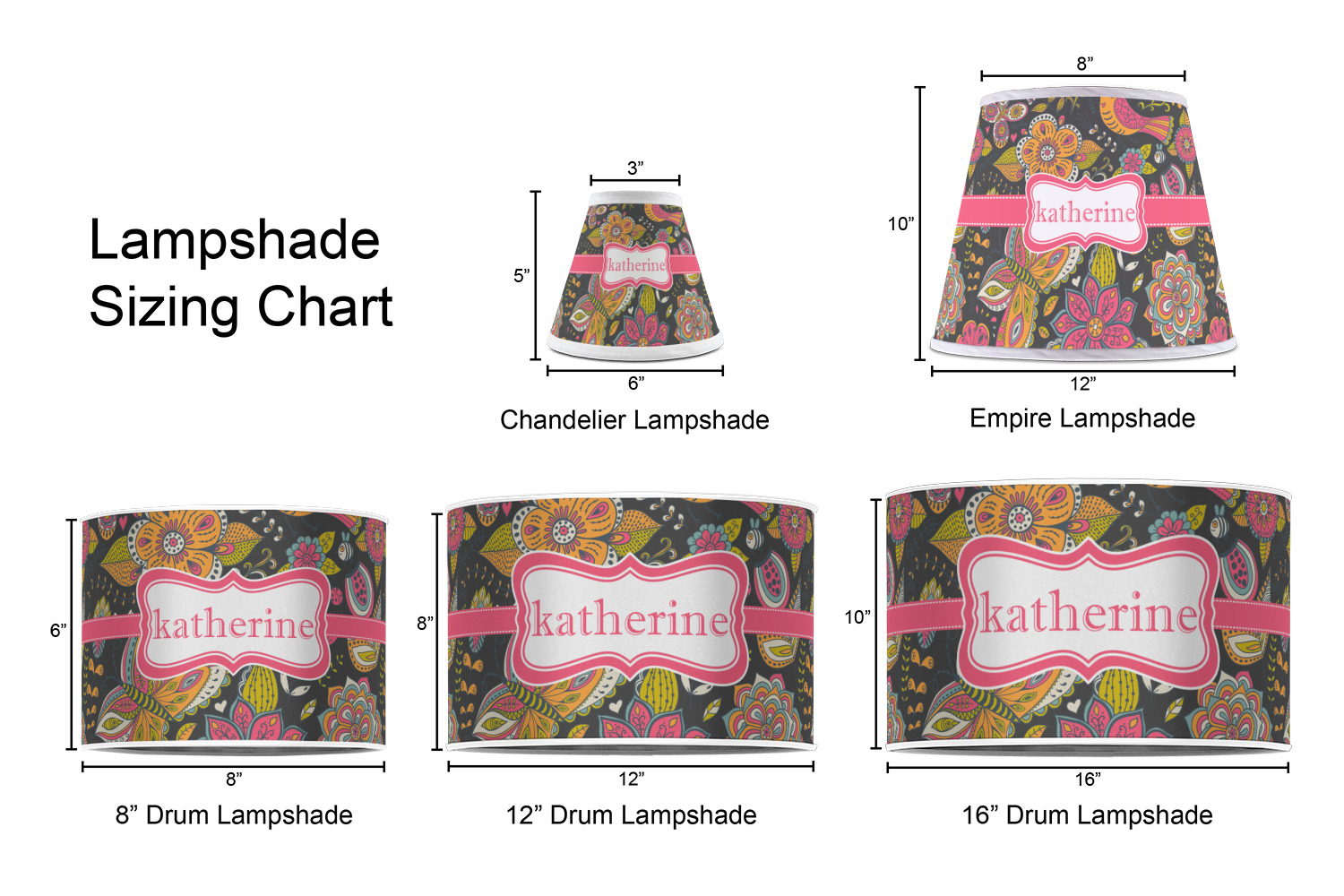 Our customized lamp shades also come in 3 different sizes: 8", 12" and 16", measuring at 8" in diameter by 6" tall, 12" in diameter by 8" tall, and 16" in diameter by 10" tall, respectively.