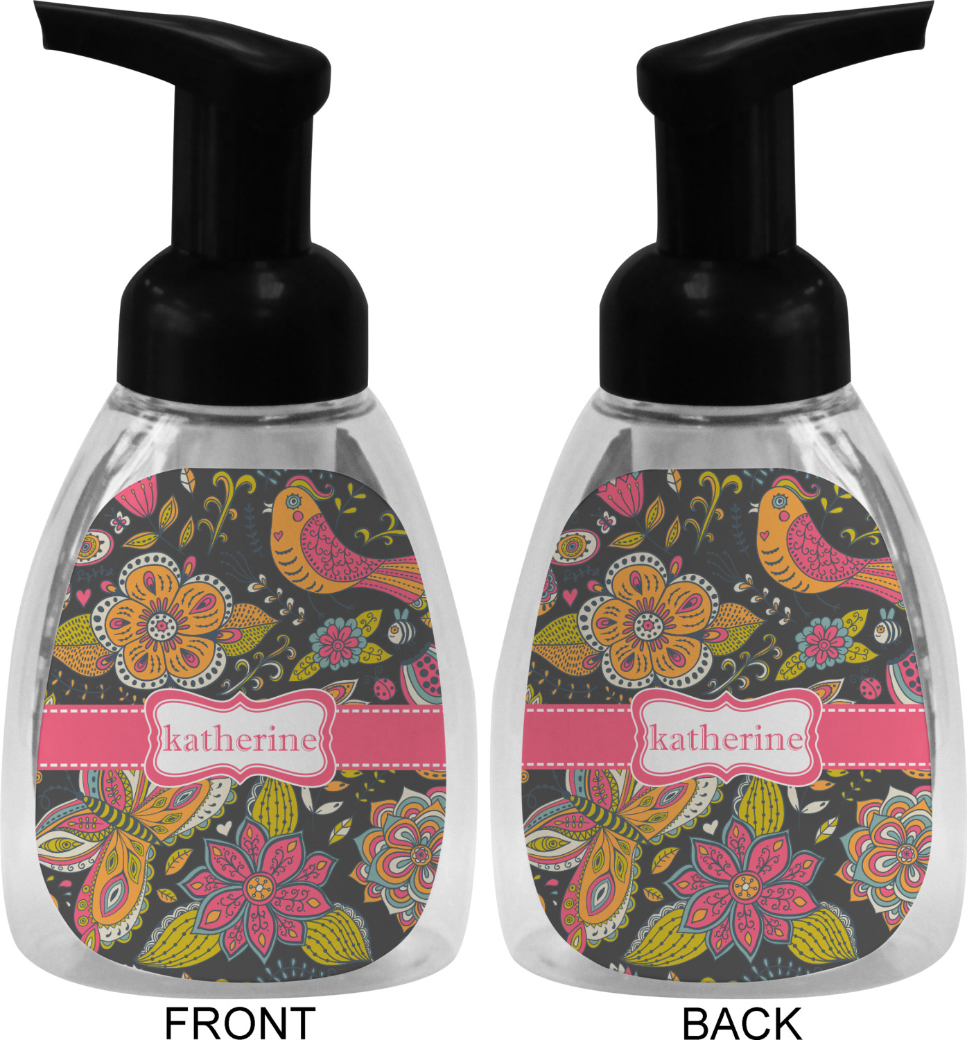 This soap dispenser is made of a robust plastic and has a clear base. The included soap pump is available in black or white color. This dispenser is 6.5 inches tall, 3 inches wide, and 2 inches deep. We display your customized designs on the front and back sides of these foaming hand soap dispensers.