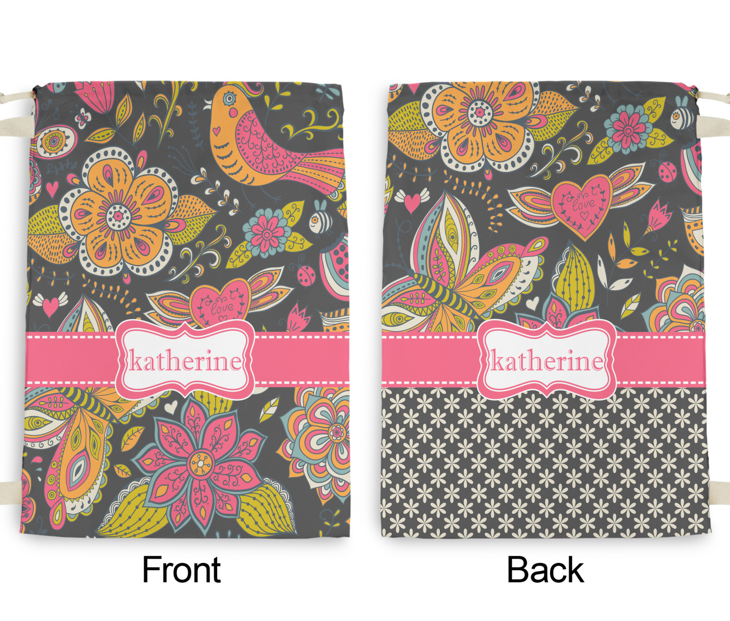 Carry your laundry in style with these customized laundry bags. Available in two sizes, featuring a natural colored woven strap and a cinch cord, these bags hold a lot of clothes or anything else you want to fit in them.