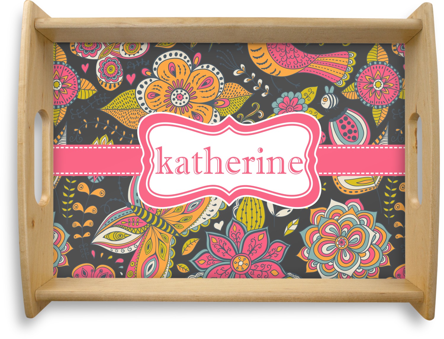 This serving tray with handles features square edges and two rounded sides, creating a very modern look. Each side is fabricated from a beautifully cut, natural wood. The bottom of the interior of the tray displays your customized design in bright, vibrant color. The tray is sold in both a black color and a natural wood look. Each variation of the wood serving tray has two sizes: Small, which is 14" x 10" x 2.25", and Large, which is 19.5" x 13.5" x 2.75".