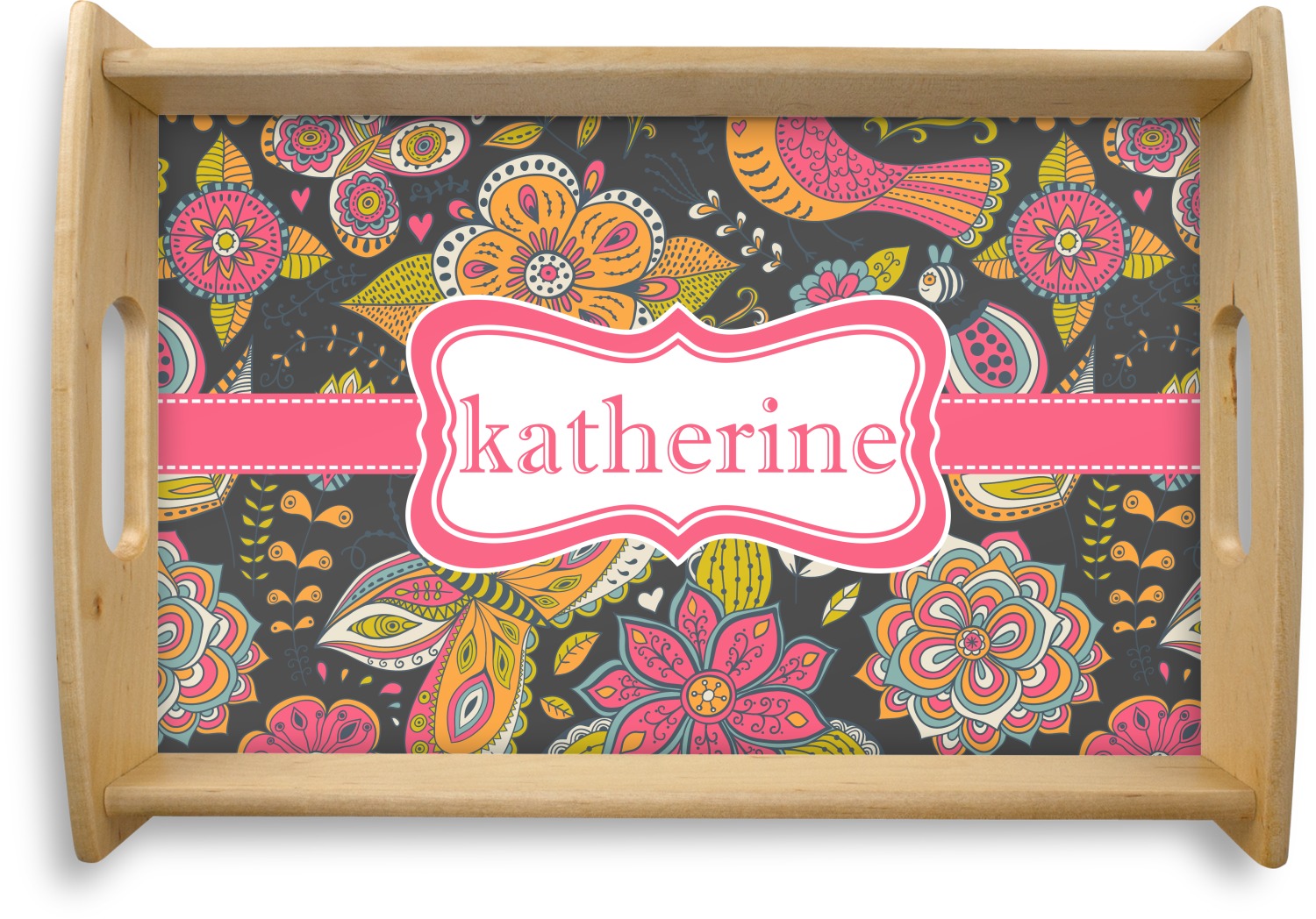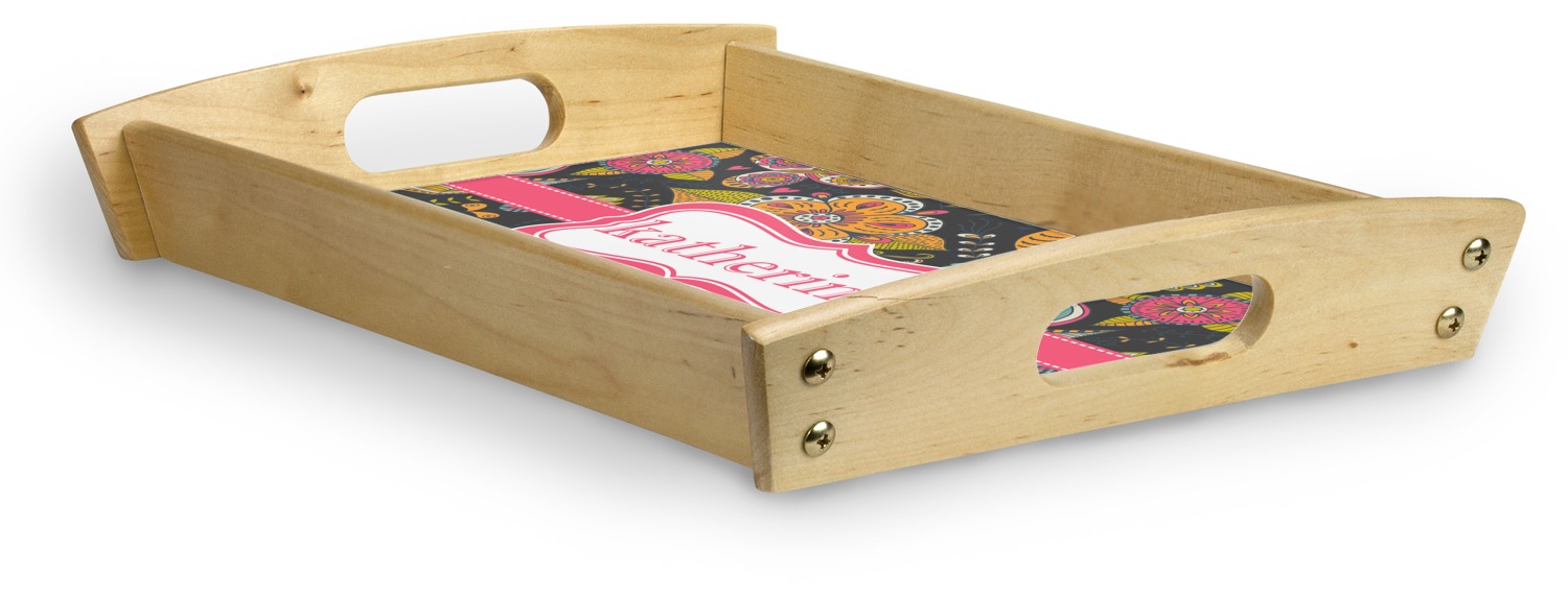 This serving tray with handles features square edges and two rounded sides, creating a very modern look. Each side is fabricated from a beautifully cut, natural wood. The bottom of the interior of the tray displays your customized design in bright, vibrant color. The tray is sold in both a black color and a natural wood look. Each variation of the wood serving tray has two sizes: Small, which is 14" x 10" x 2.25", and Large, which is 19.5" x 13.5" x 2.75".