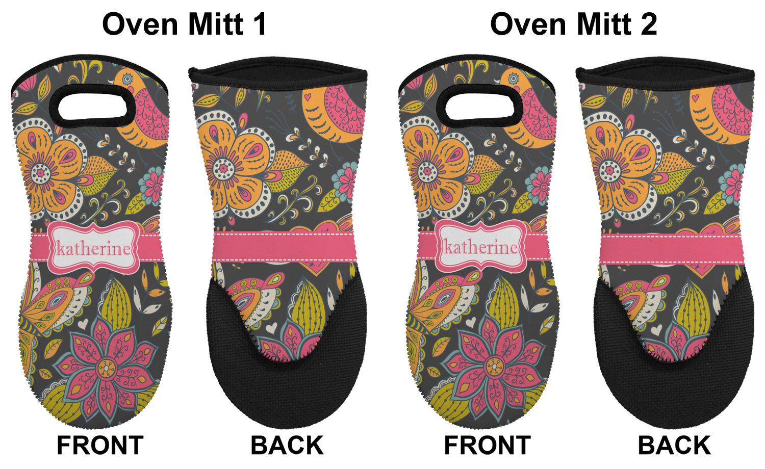 These heat resistant gloves are made entirely of a durable neoprene; the front features a softer texture, while the palm's side has a textured surface, meant to handle heat up to 500 degrees Fahrenheit. Thick, heavy duty stitching connects the two sides. A small, oval cutout appears on the front, and can be used to hang and store the mitt. Your personalization appears on the front, and the upper part of the back of the mitt. The style of these oven mitts are suitable for both the right and left hand, depending on your needs. If you need one for each hand, be sure to order two!