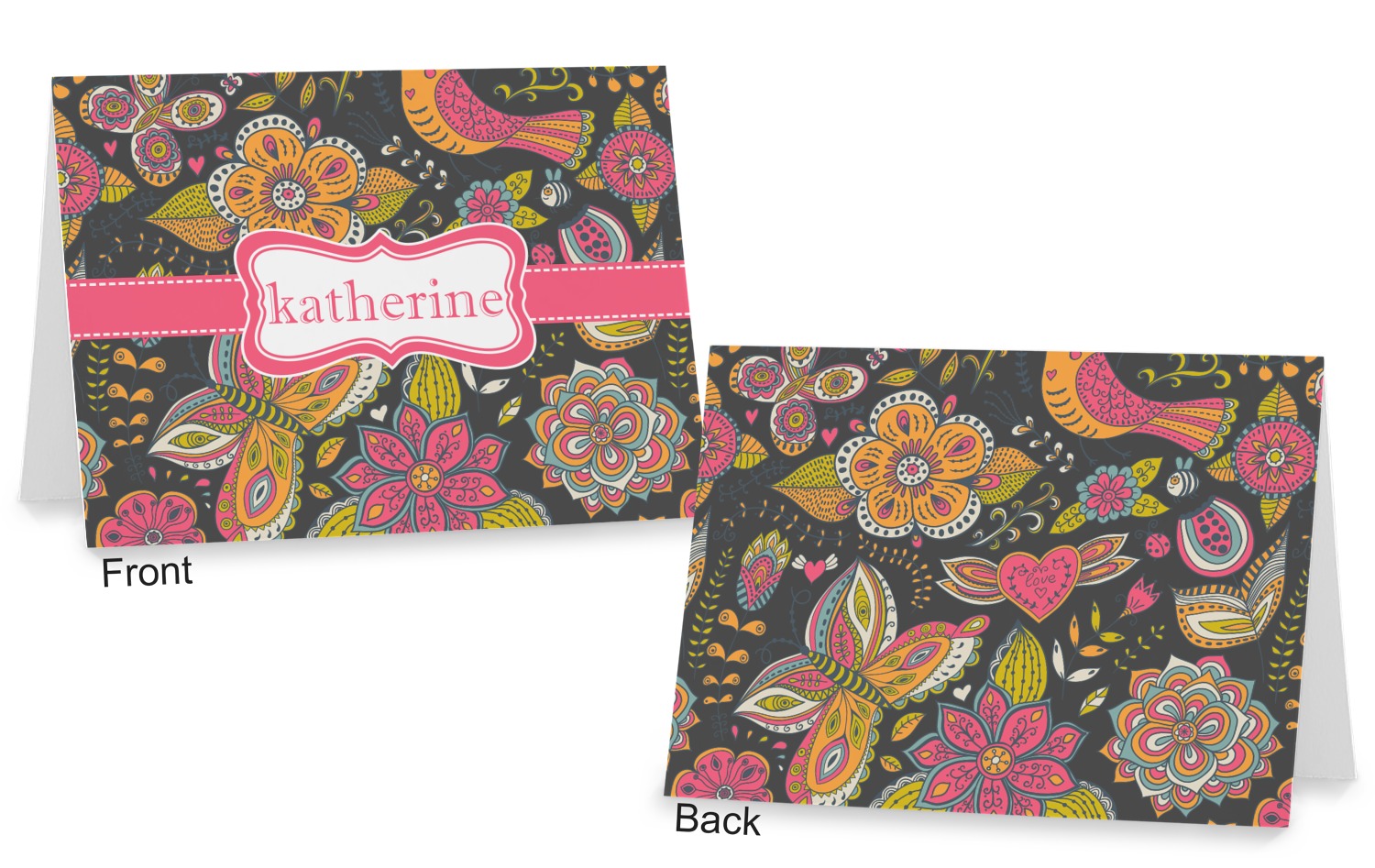 Our custom folded note cards are printed on premium 100lb. card stock and comes with white envelopes. The note card measure 5.5 by 4.25 inches and are blank on the inside for your handwritten message.