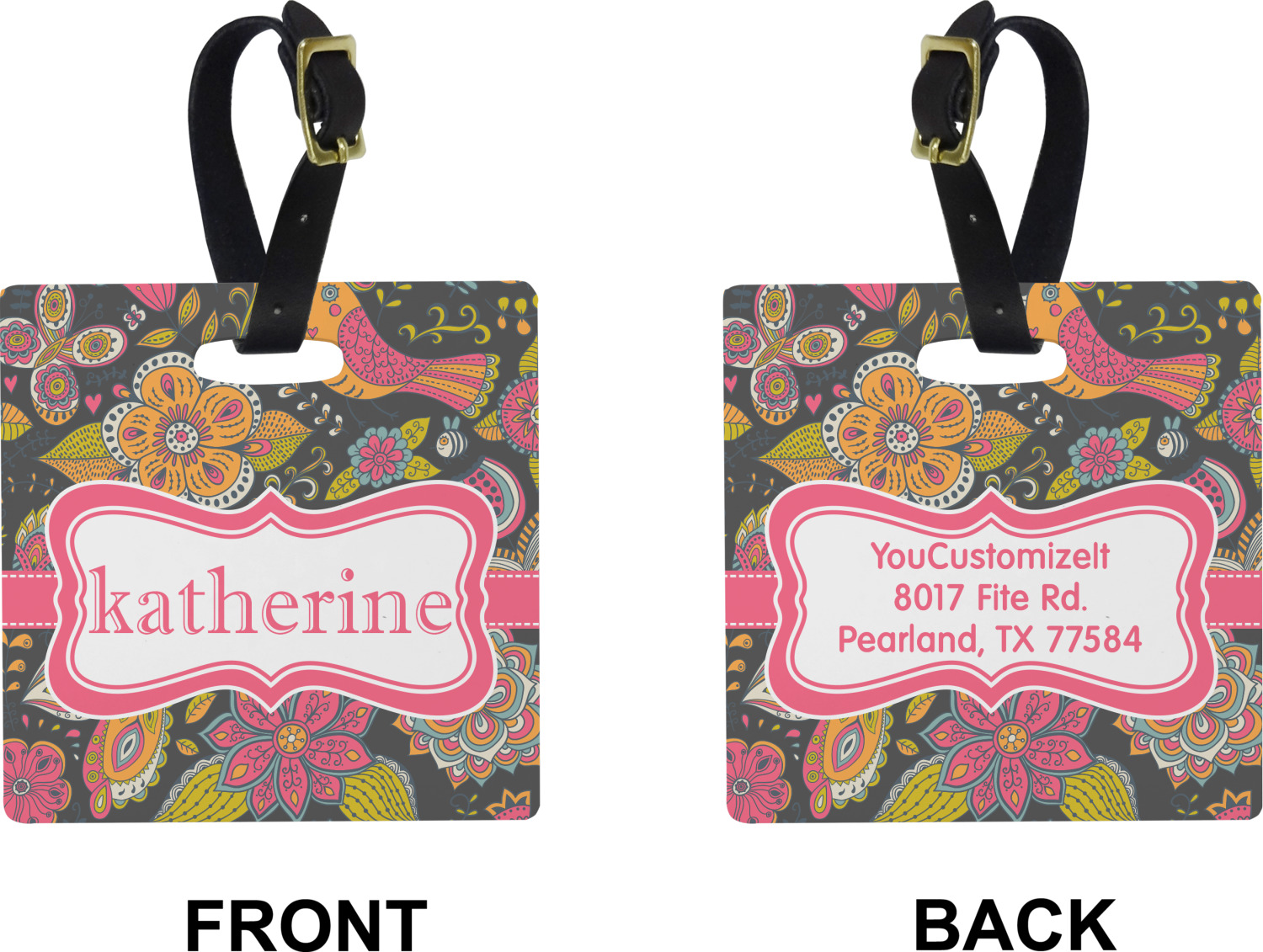 These cute luggage tags are made of a fiber-reinforced, UV-resistant plastic, making them waterproof and durable enough for both everyday use and the rugged adventures of any traveler! A leather strap with holes and a buckle is included with your purchase and can be used to attach your custom luggage tag to any suitcase, backpack, or duffel bag. You can design these travel tags as you wish; your customization will be displayed across the front, while the back will show as little or as much personal information as you want.