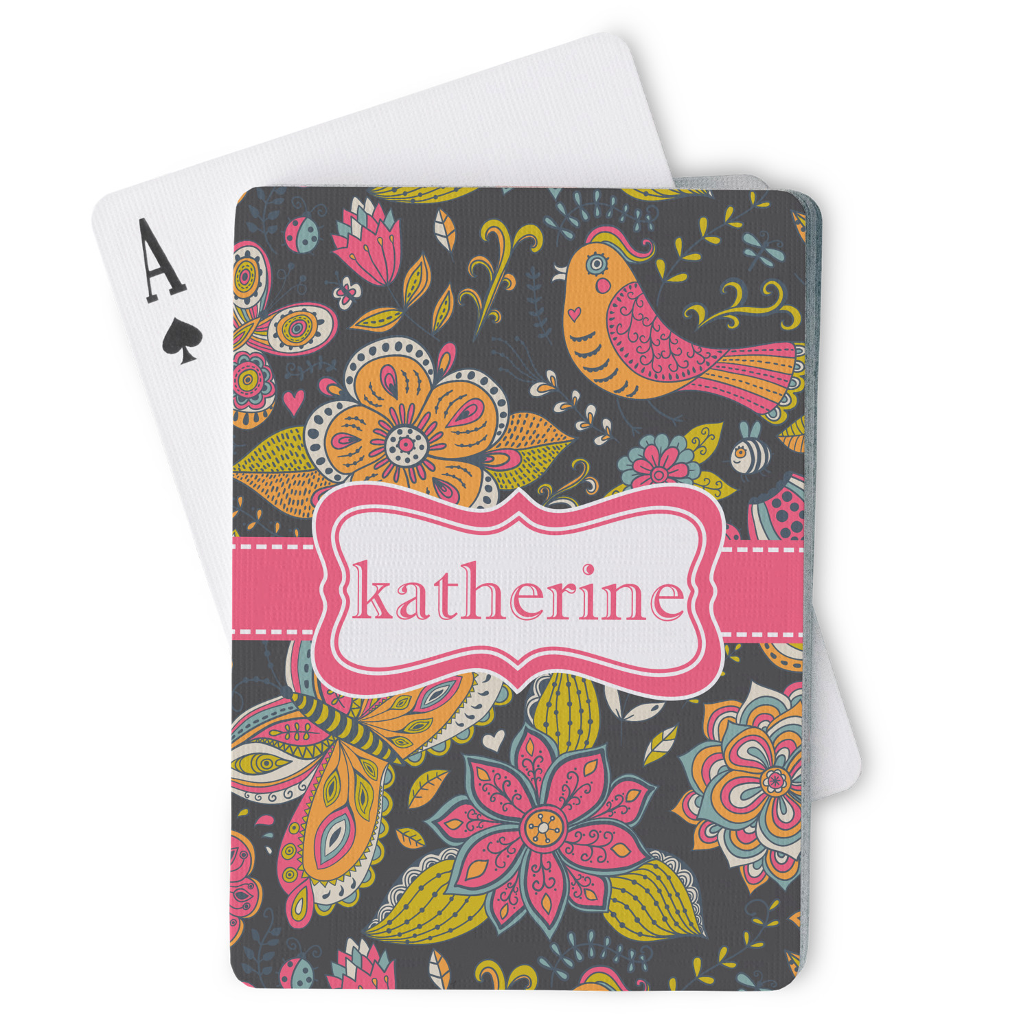 The customization / personalization is printed on the back side. The playing cards have a low gloss coating on both sides. The cards are packaged in a clear plastic box.