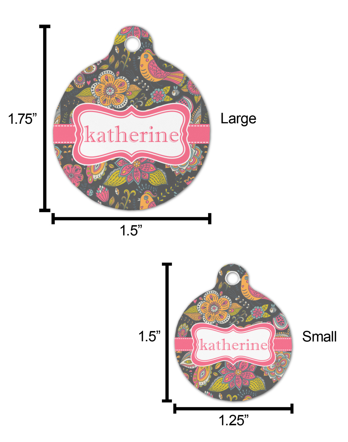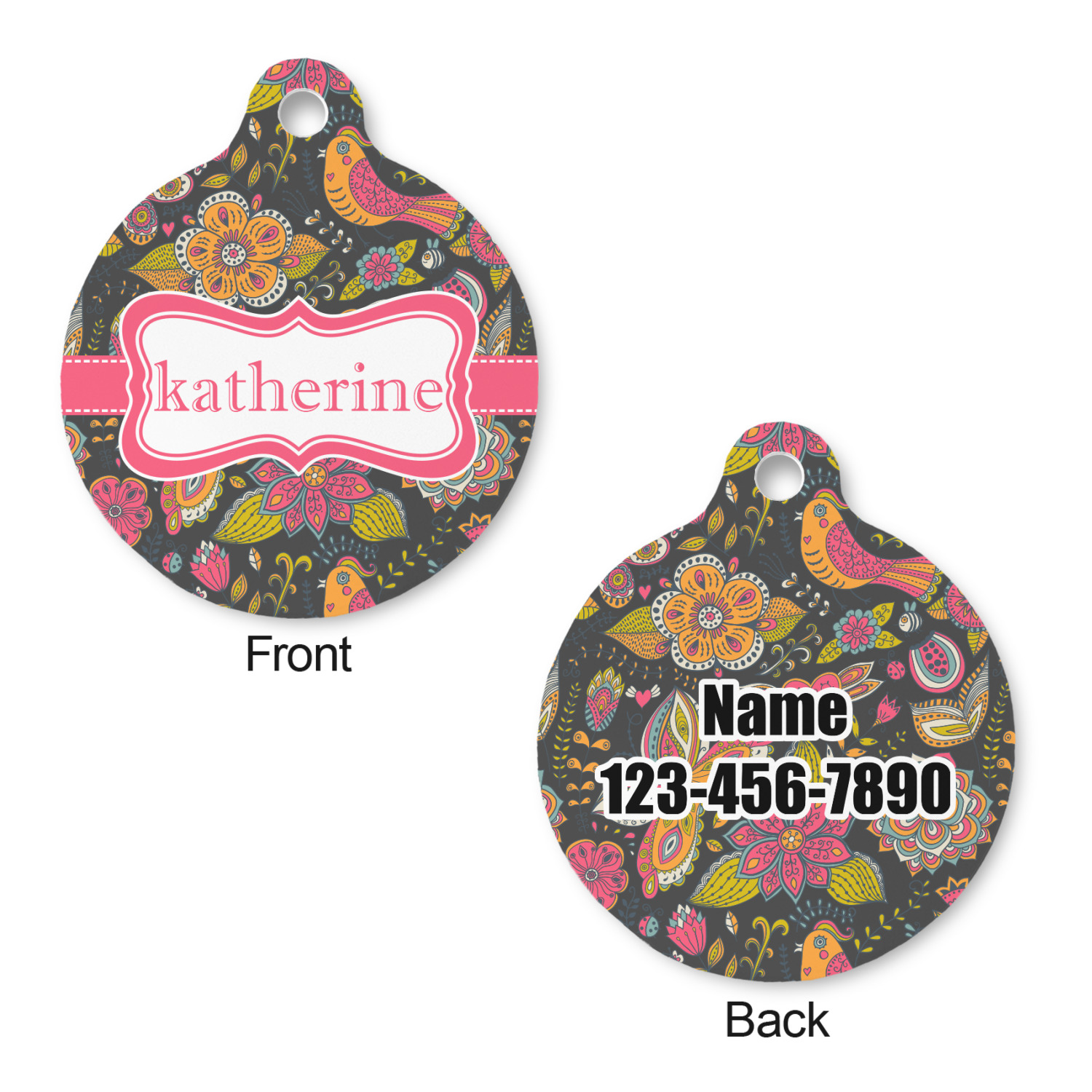 Go ahead; skip the monotony of plain pet ID tags with your very own, customized & personalized, round pet tag! This pet ID tag, fitting for both cats and dogs, will catch the eye of any onlooker (humans, canines, and felines, alike!) and accentuate your pet's individual personality.