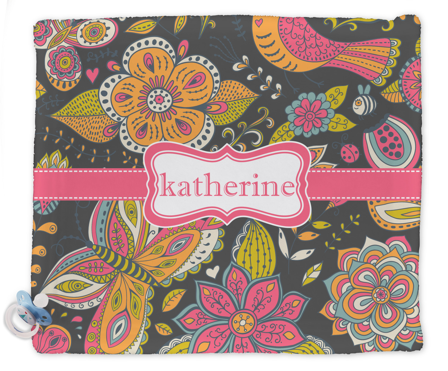 A pink ribbon with white stitching attached to a decorative white label trimmed in pink ties the entire design together. Add personalization of your choice in a coordinating color to make this pattern even more special.