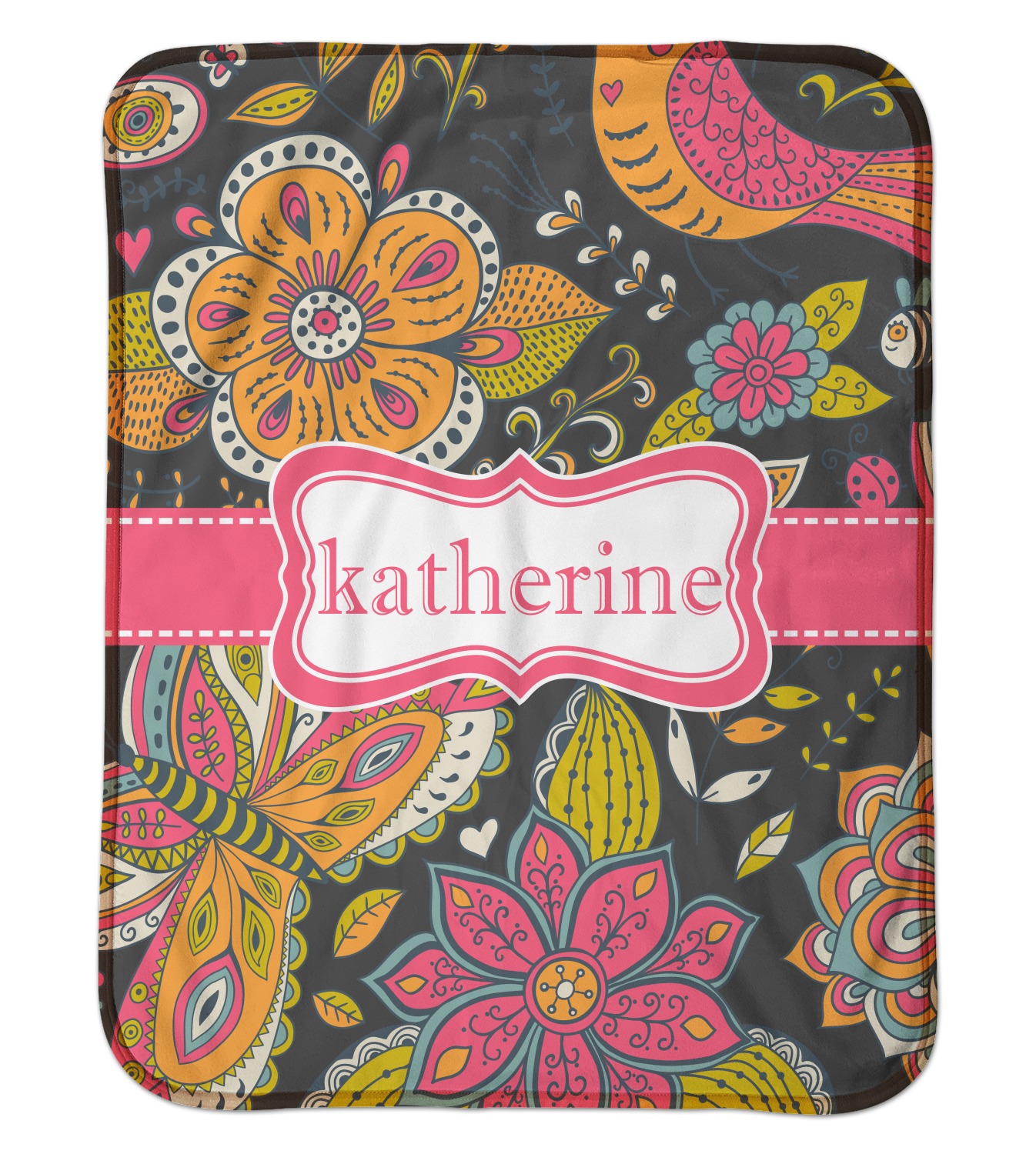 A pink ribbon with white stitching attached to a decorative white label trimmed in pink ties the entire design together. Add personalization of your choice in a coordinating color to make this pattern even more special.
