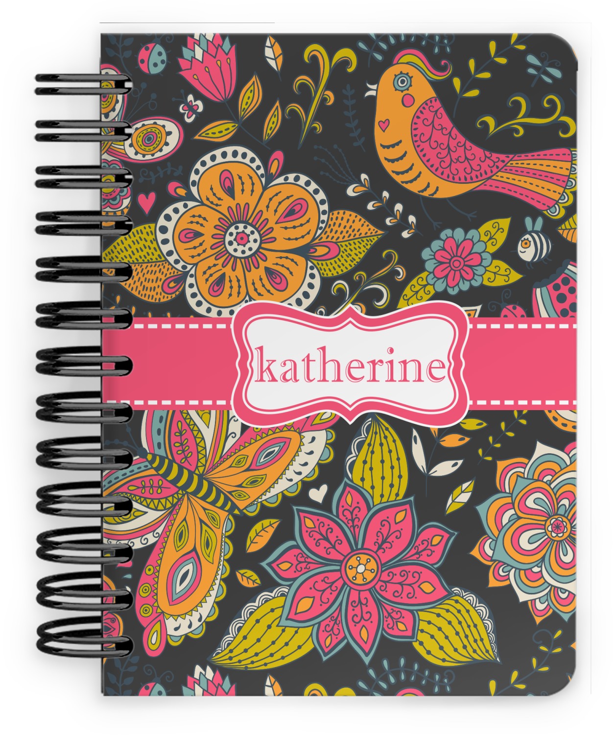 This spiral notebook includes 75 sheets of thick, ruled paper. The front and back of this custom notebook is made of a robust, laminate, plastic covering. We print your personalization on these two panels, underneath a glossy finish, which emphasizes the colors of your design. The two panels and the sheets of paper are held together by a sturdy, black coil. The paper within your bound notebook is perforated for easy, clean tearing.